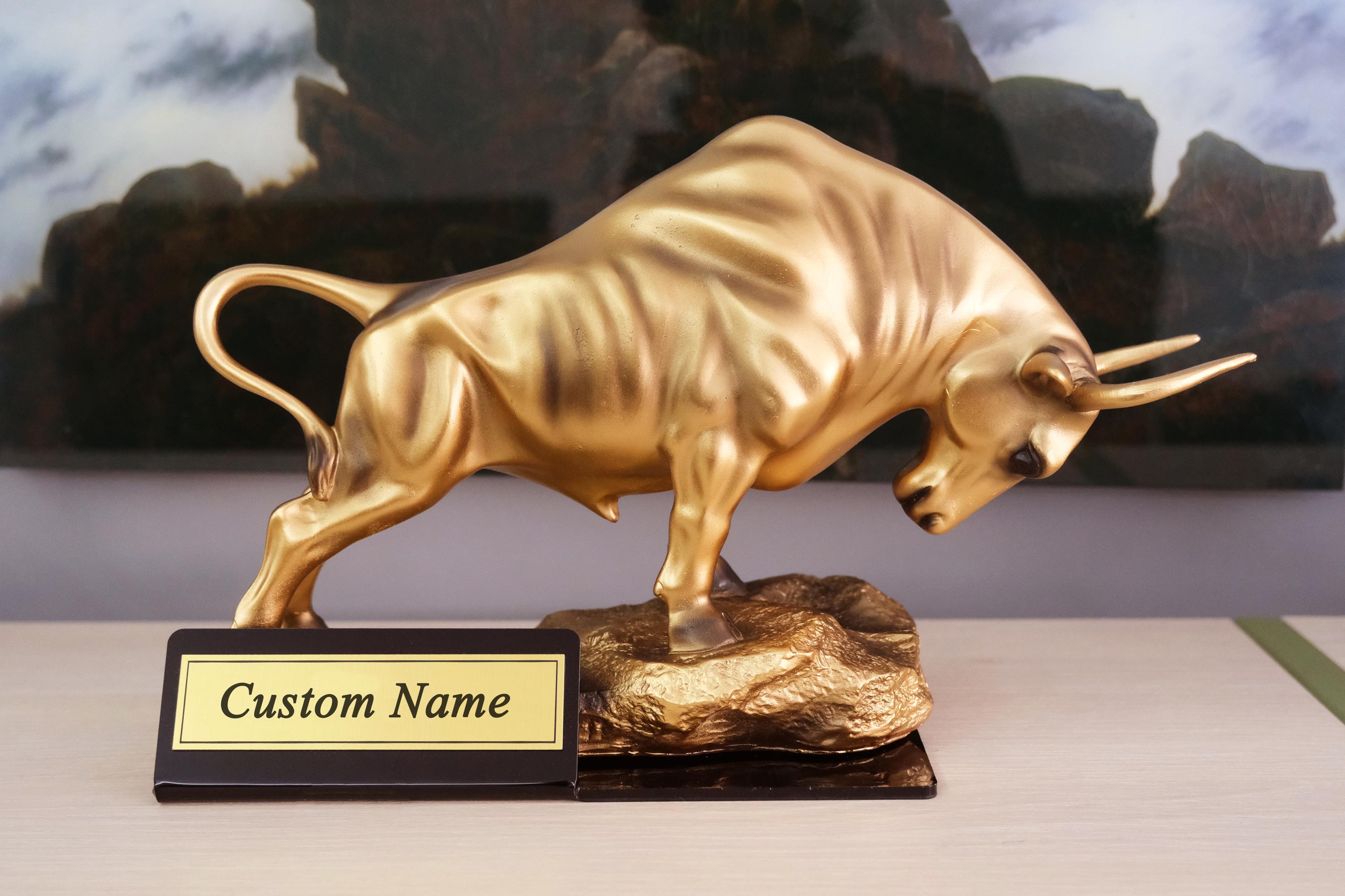 Personalized Wall Street Bull Statue - Custom Name Stock Market Gift for Trader, Broker, Investor - Large Gold Bull Sculpture Office Decor