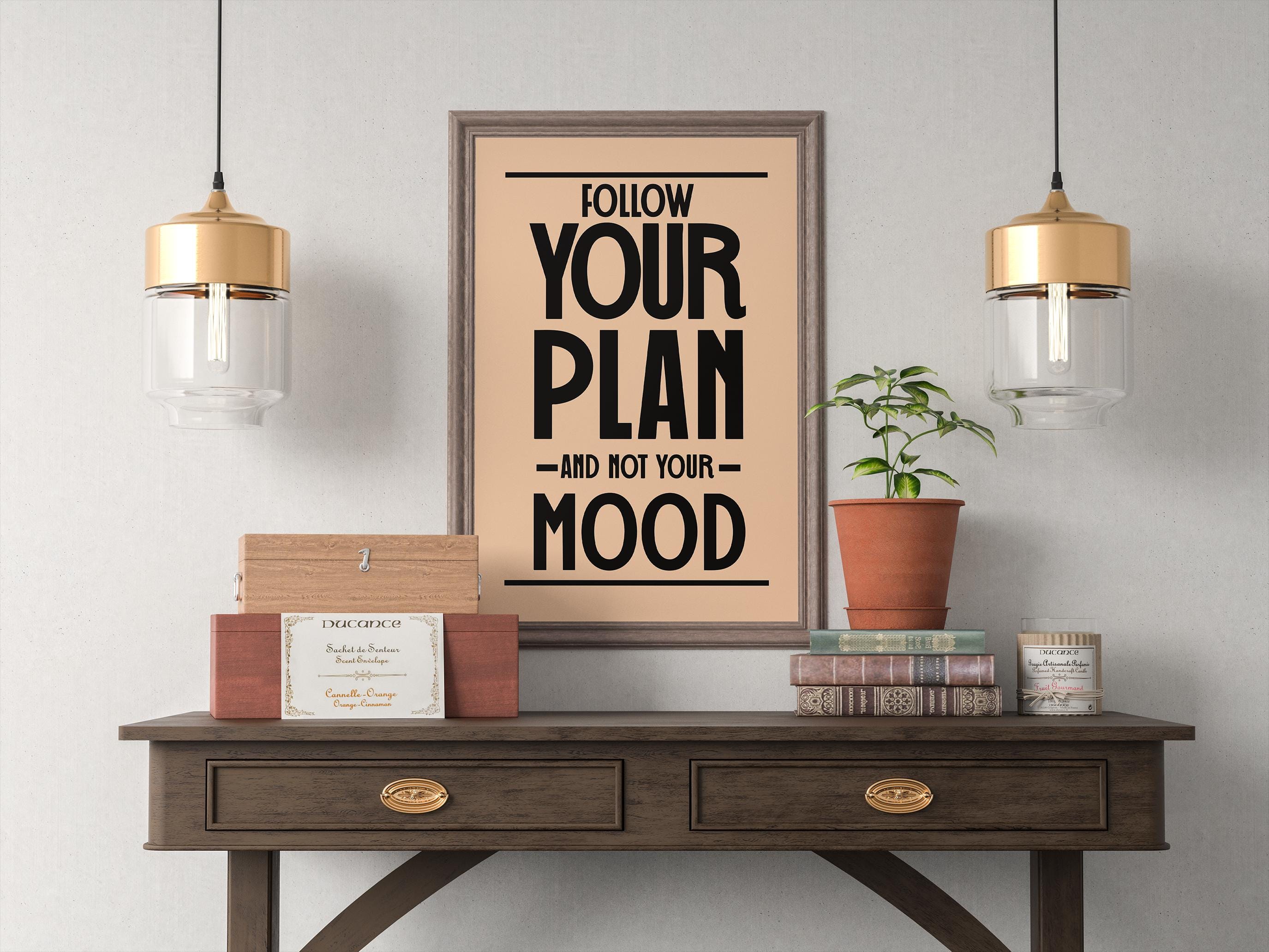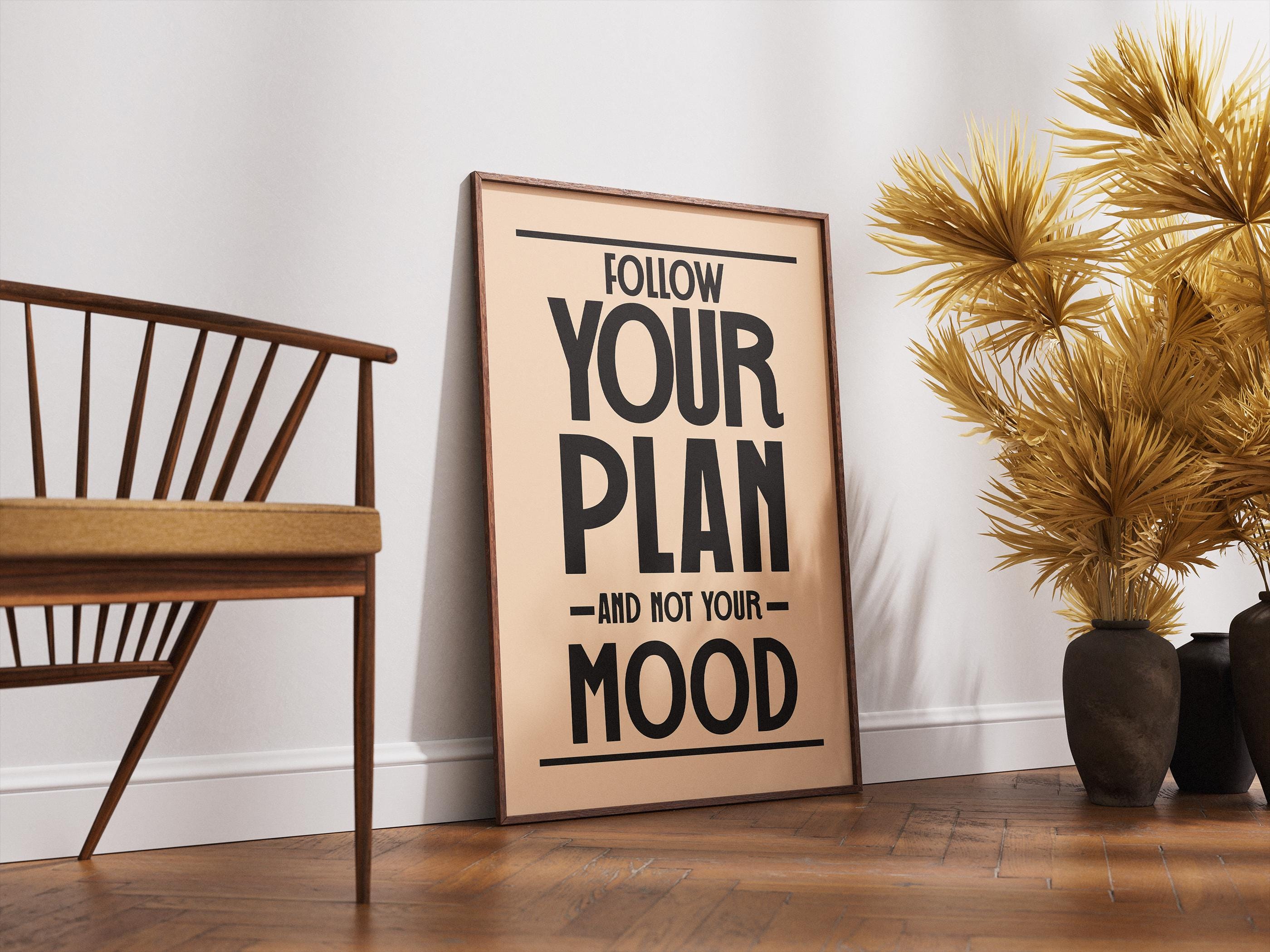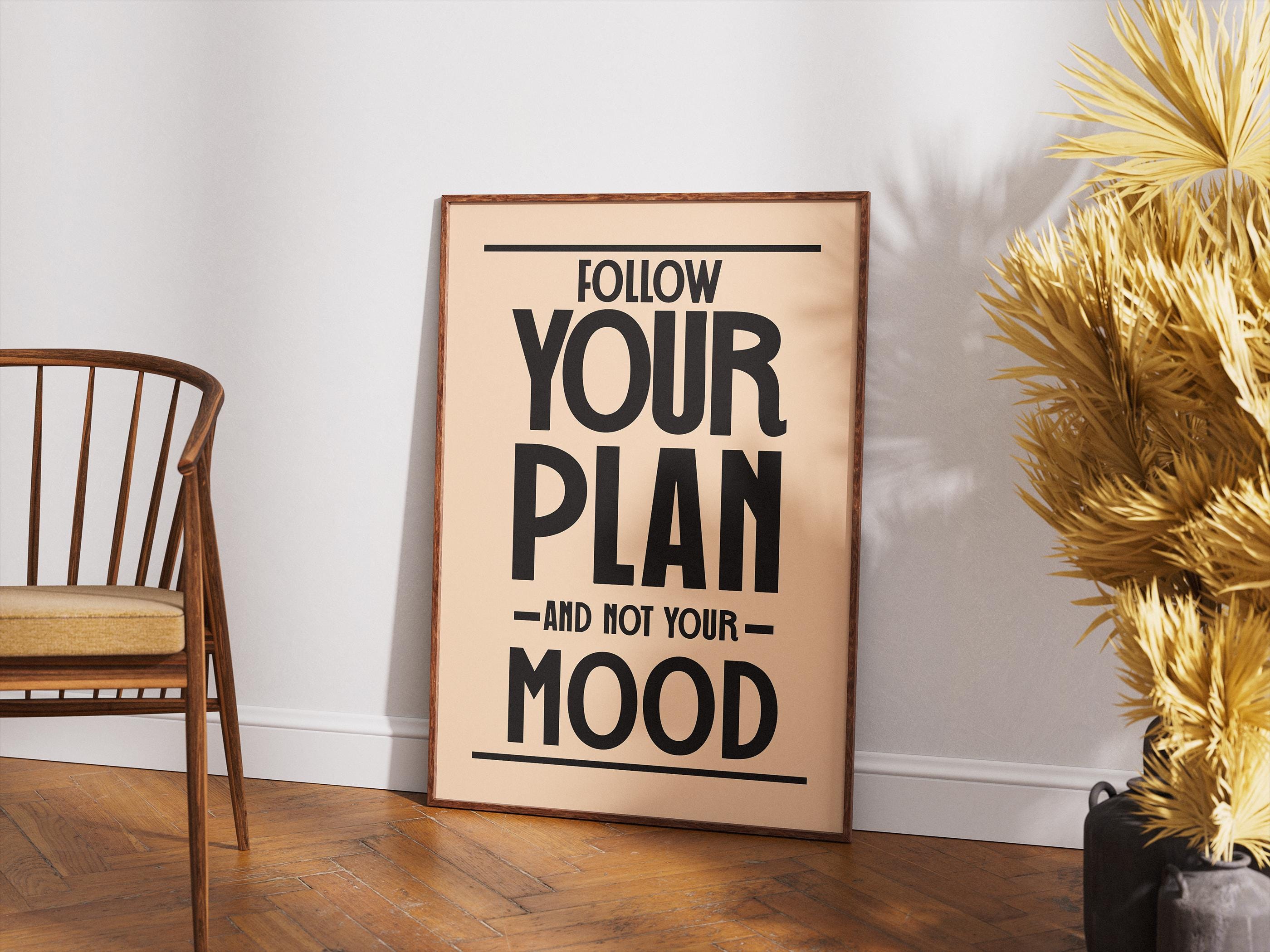 Enhance your space with this inspiring rolled poster that perfectly balances motivation and aesthetics. Crafted from high-quality paper options, this poster features the uplifting message, "Follow your plan and not your mood." The sleek design adds a modern touch, making it an ideal addition to your home office, creative studio, or any personal sanctuary. It's perfect for students, professionals, and anyone looking to stay focused and inspired. This poster makes a thoughtful gift for birthdays, graduations, or as a boost for those starting a new journey, celebrating milestones, or simply looking to invigorate their daily routine.