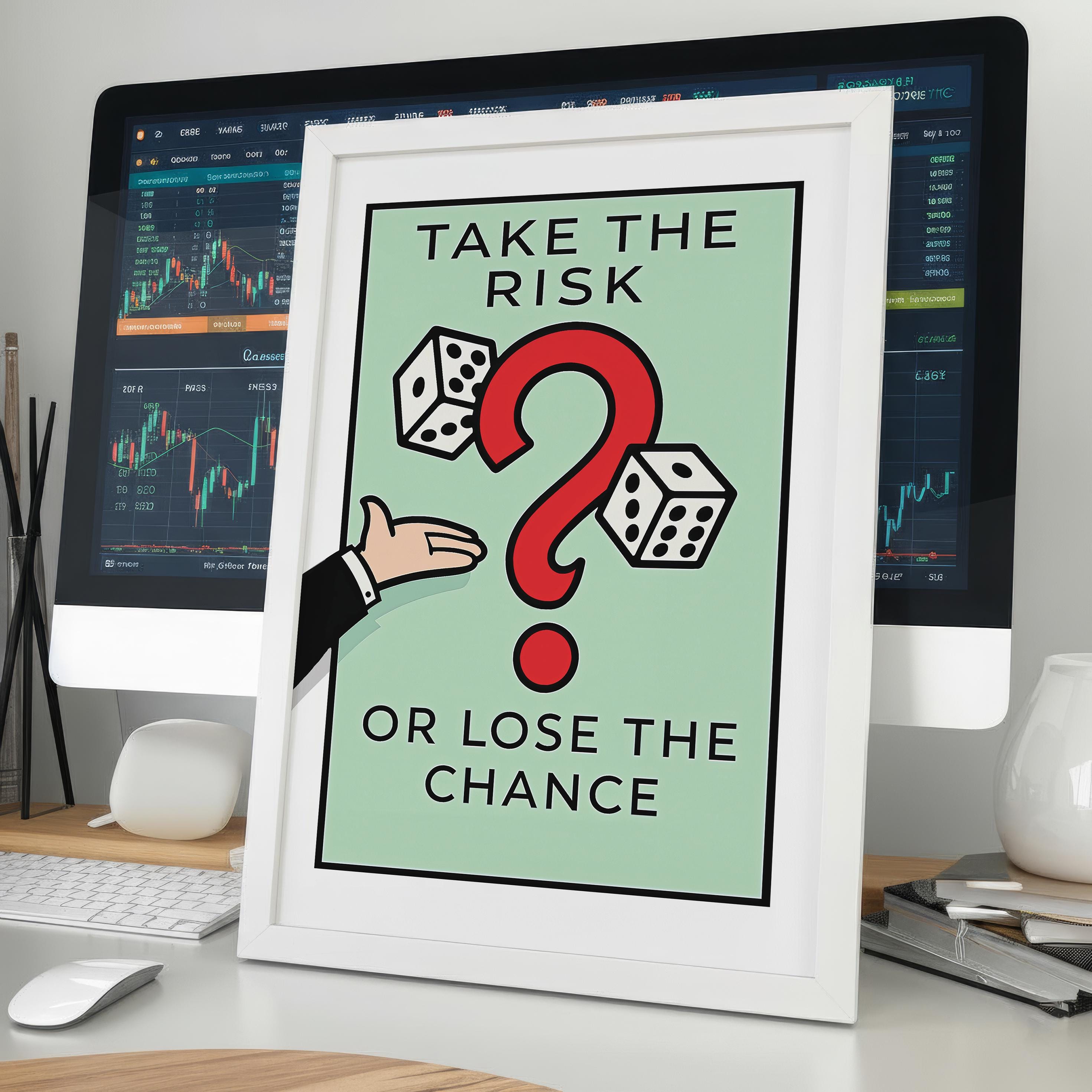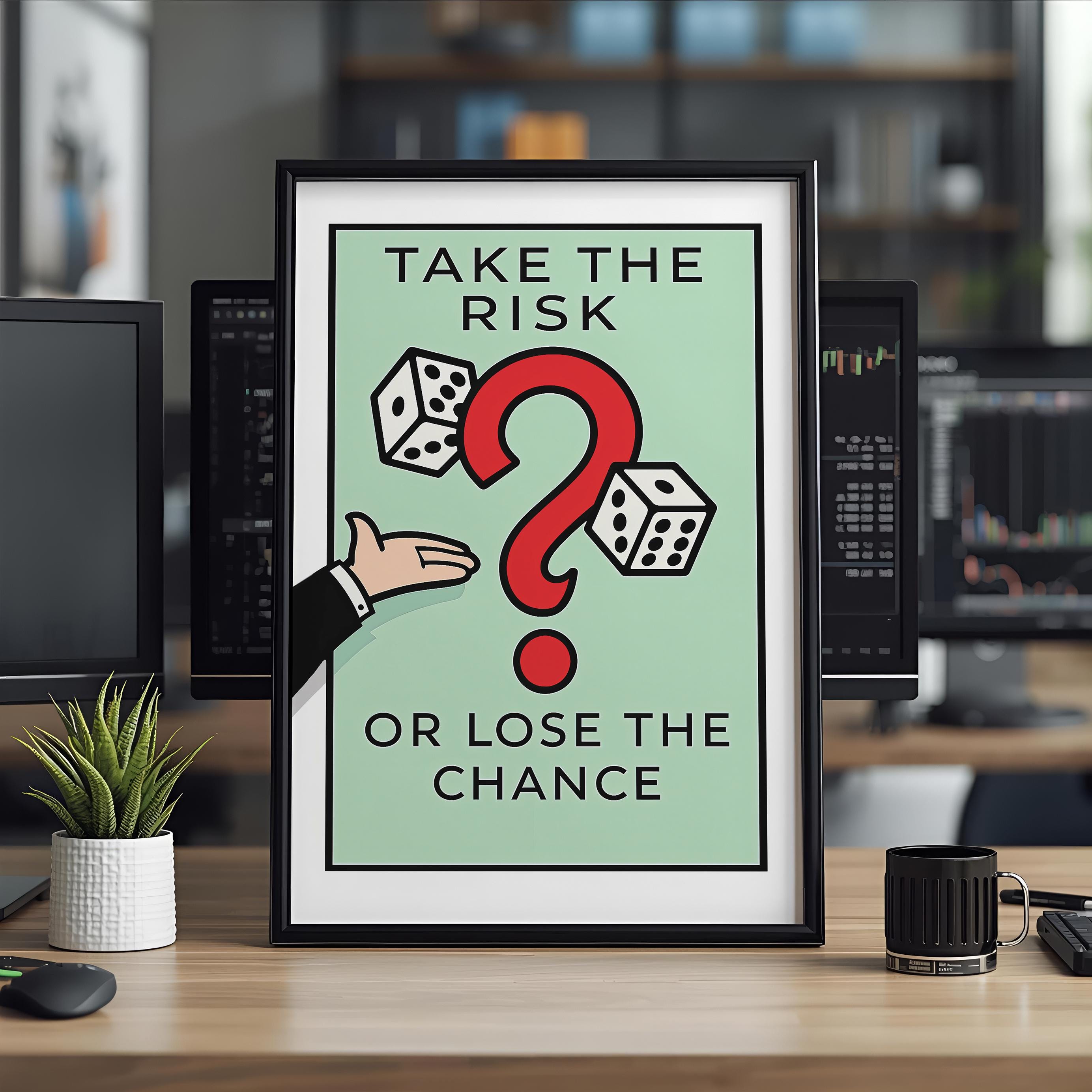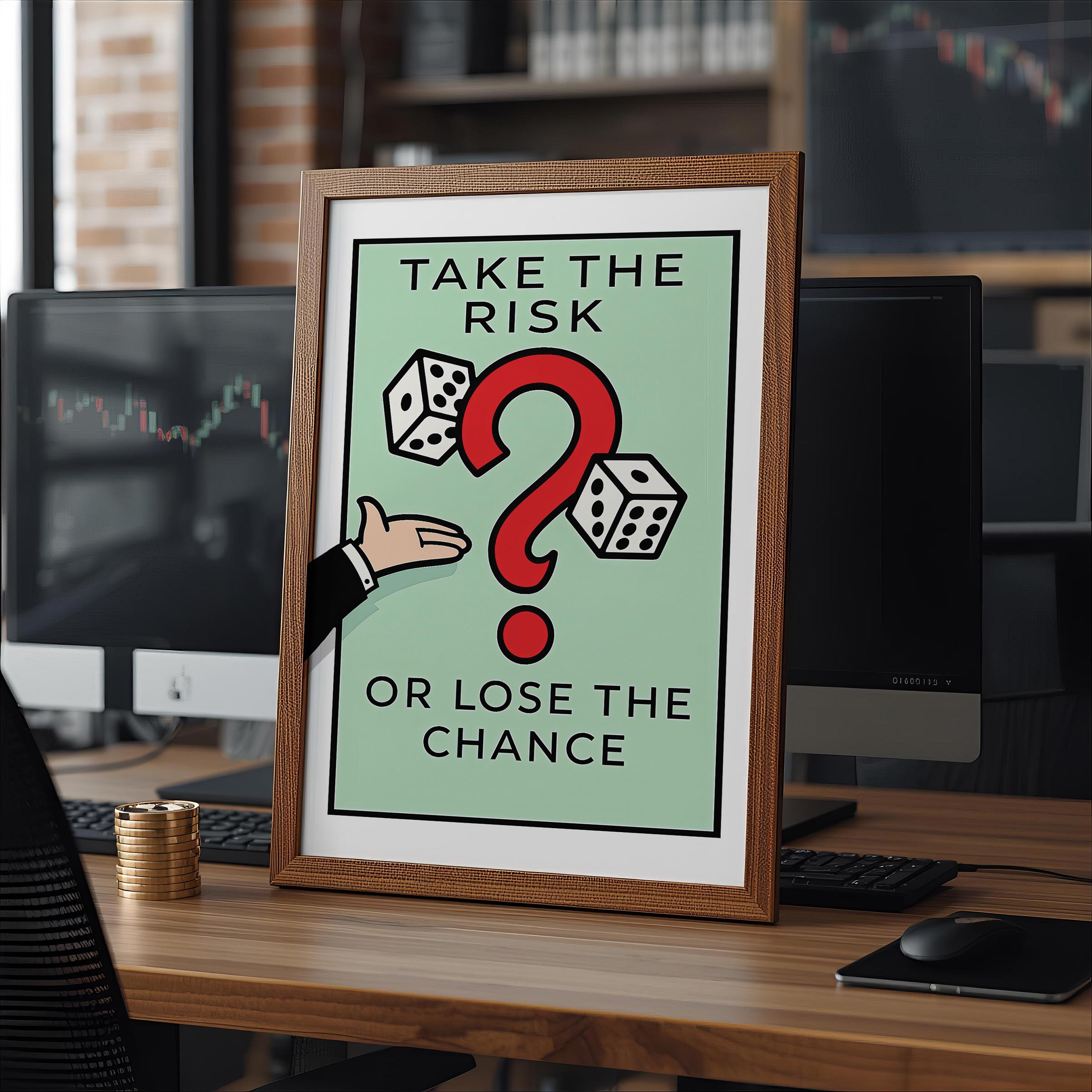 A bold, vintage-inspired poster that nudges you toward action. Mint green, crisp black borders and retro art-deco lettering frame a large red question mark and tumbling dice — a simple visual reminder to choose risk over regret. The design reads like a personal manifesto: short, clear, and confidently optimistic. Hang it where decisions are made — a home office, studio, or game room — to spark momentum on slow mornings and push through creative hesitation. The poster’s strong graphic lines and limited palette suit modern minimalists and lovers of mid-century poster art alike.