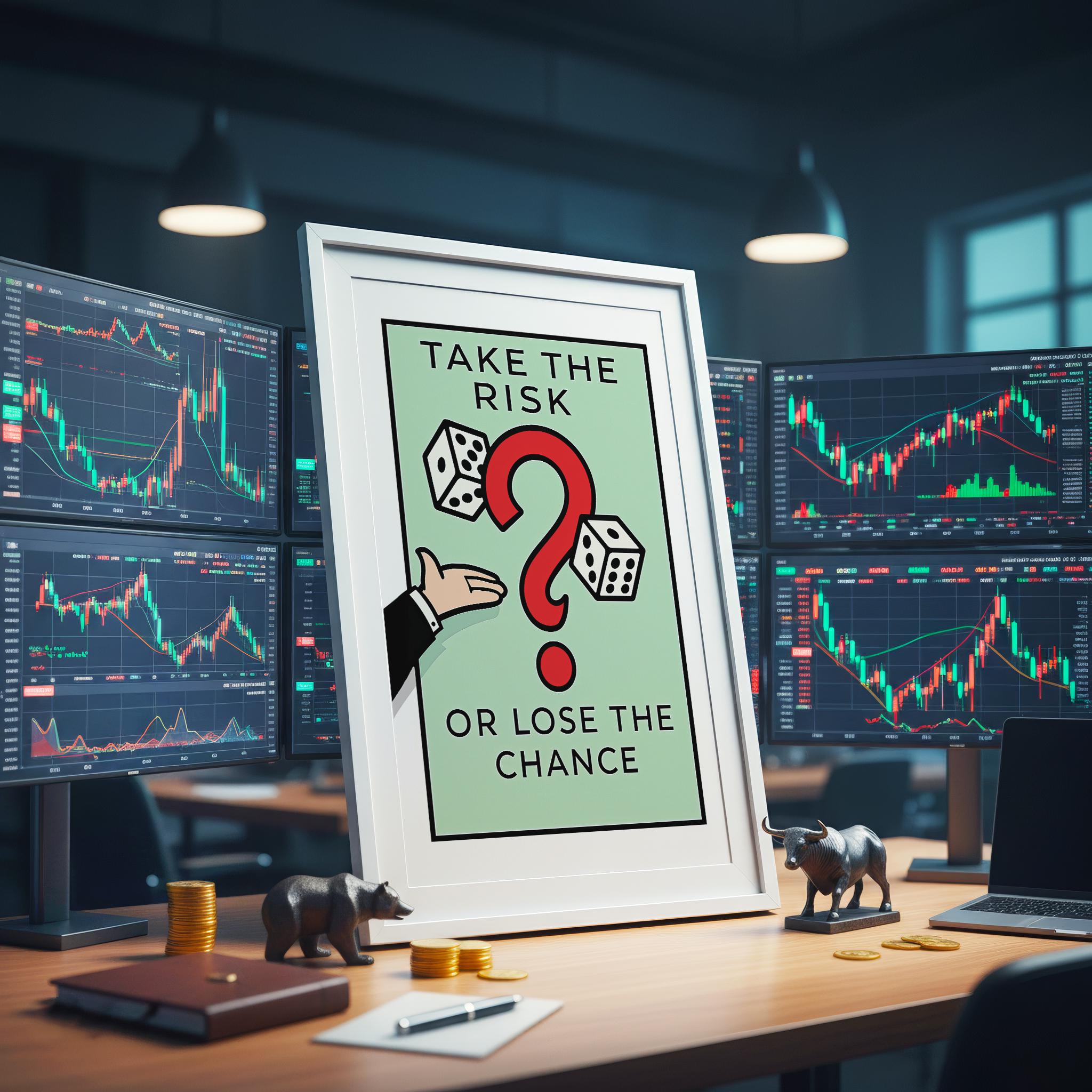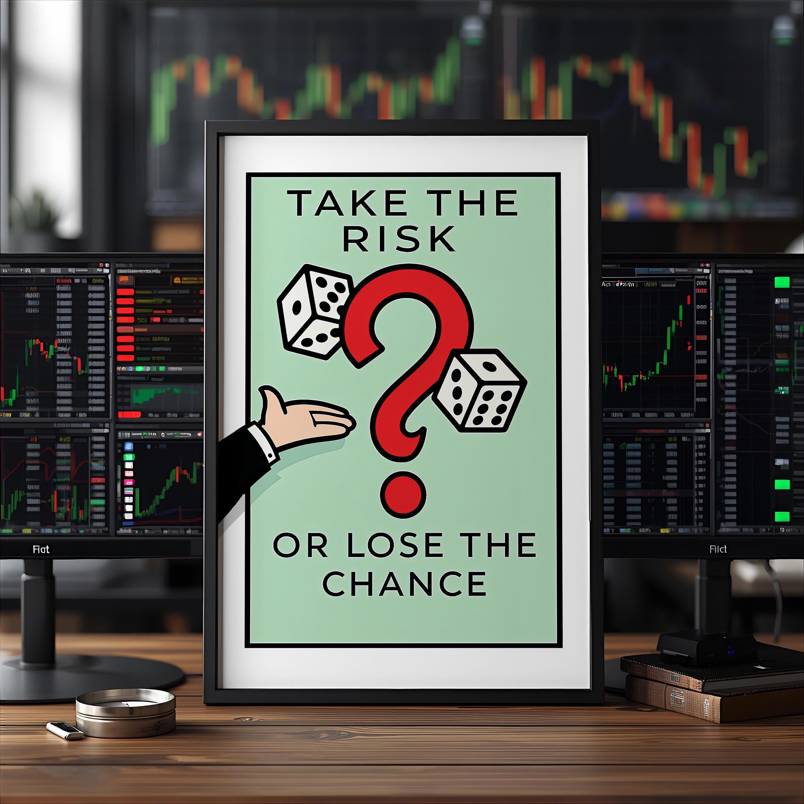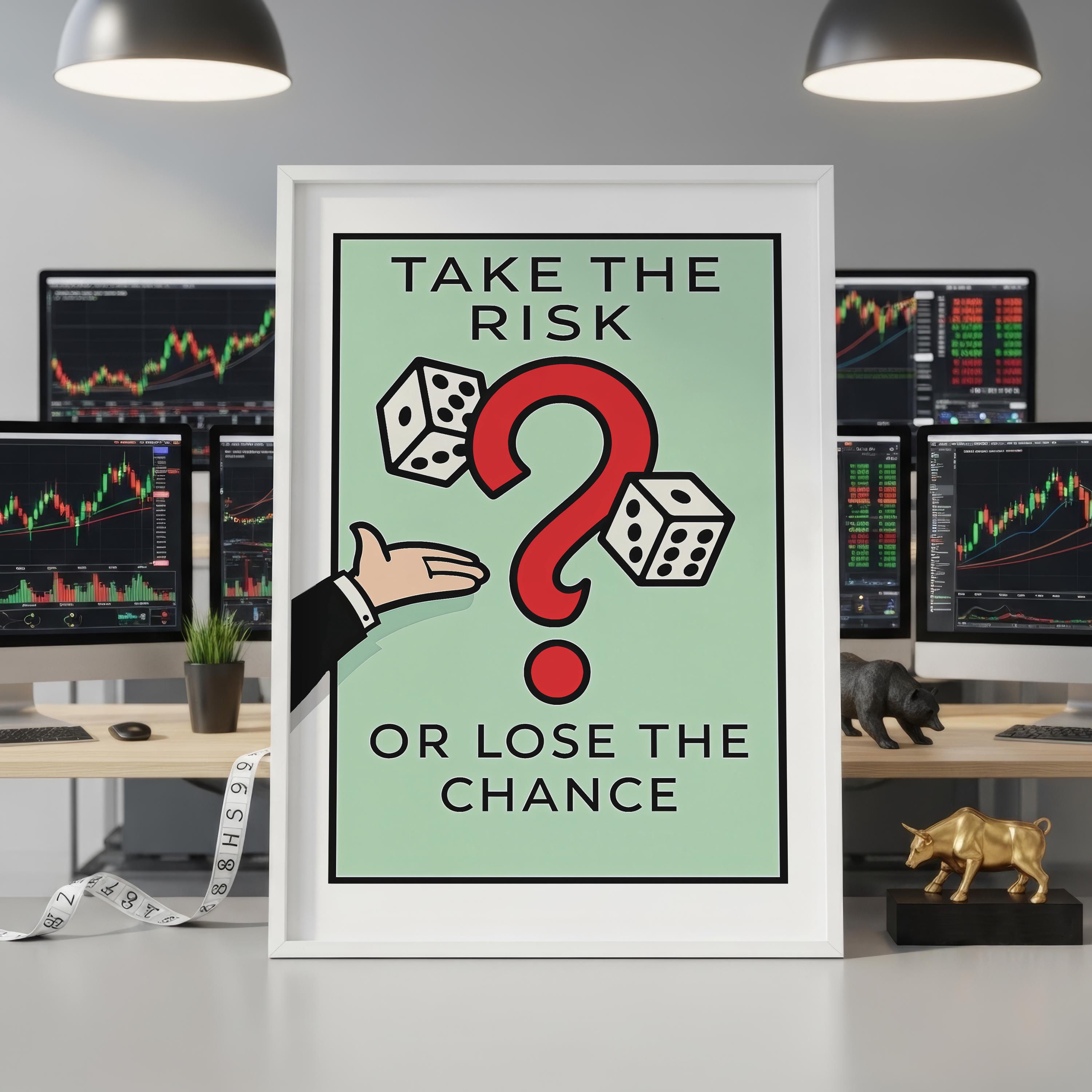 A bold, vintage-inspired poster that nudges you toward action. Mint green, crisp black borders and retro art-deco lettering frame a large red question mark and tumbling dice — a simple visual reminder to choose risk over regret. The design reads like a personal manifesto: short, clear, and confidently optimistic. Hang it where decisions are made — a home office, studio, or game room — to spark momentum on slow mornings and push through creative hesitation. The poster’s strong graphic lines and limited palette suit modern minimalists and lovers of mid-century poster art alike.