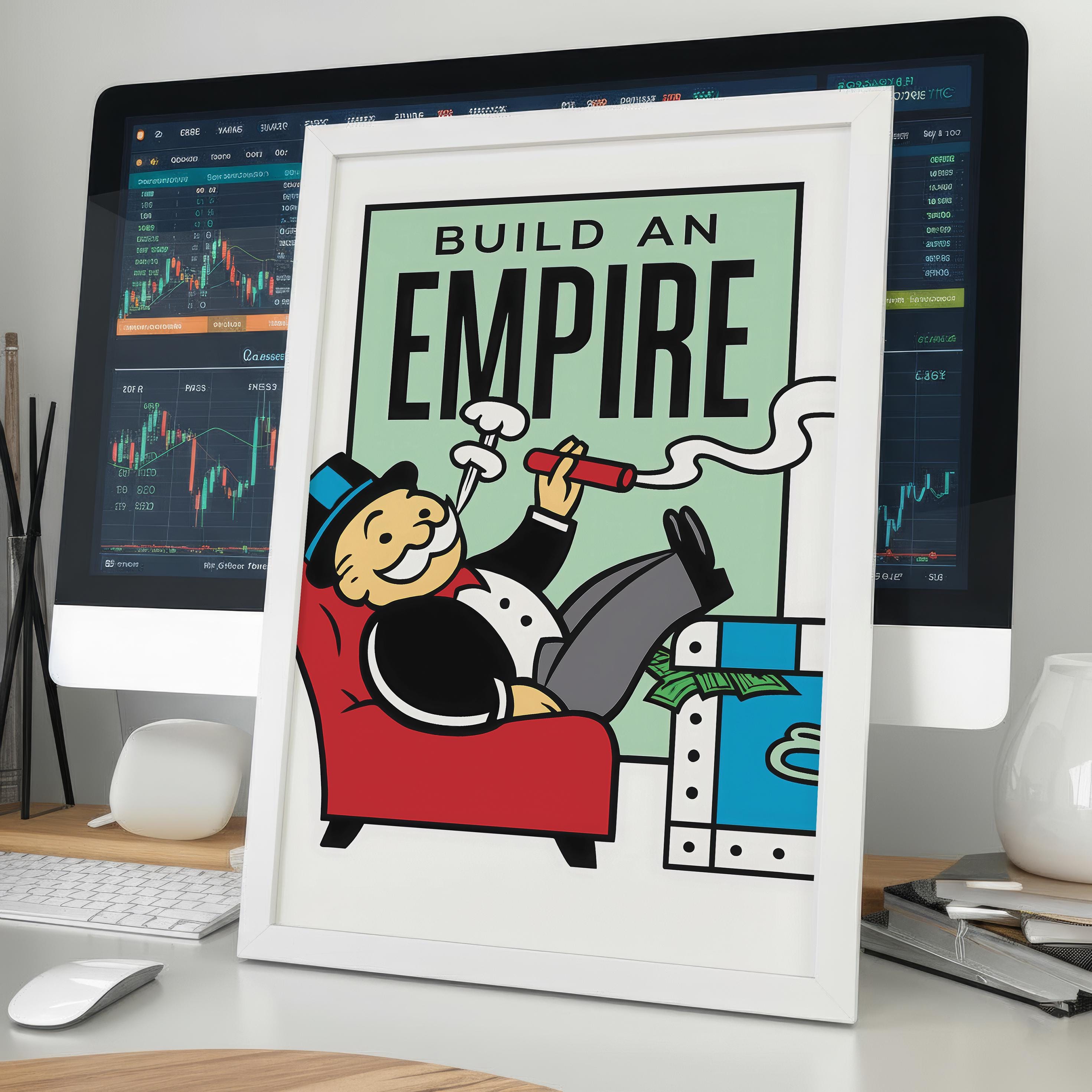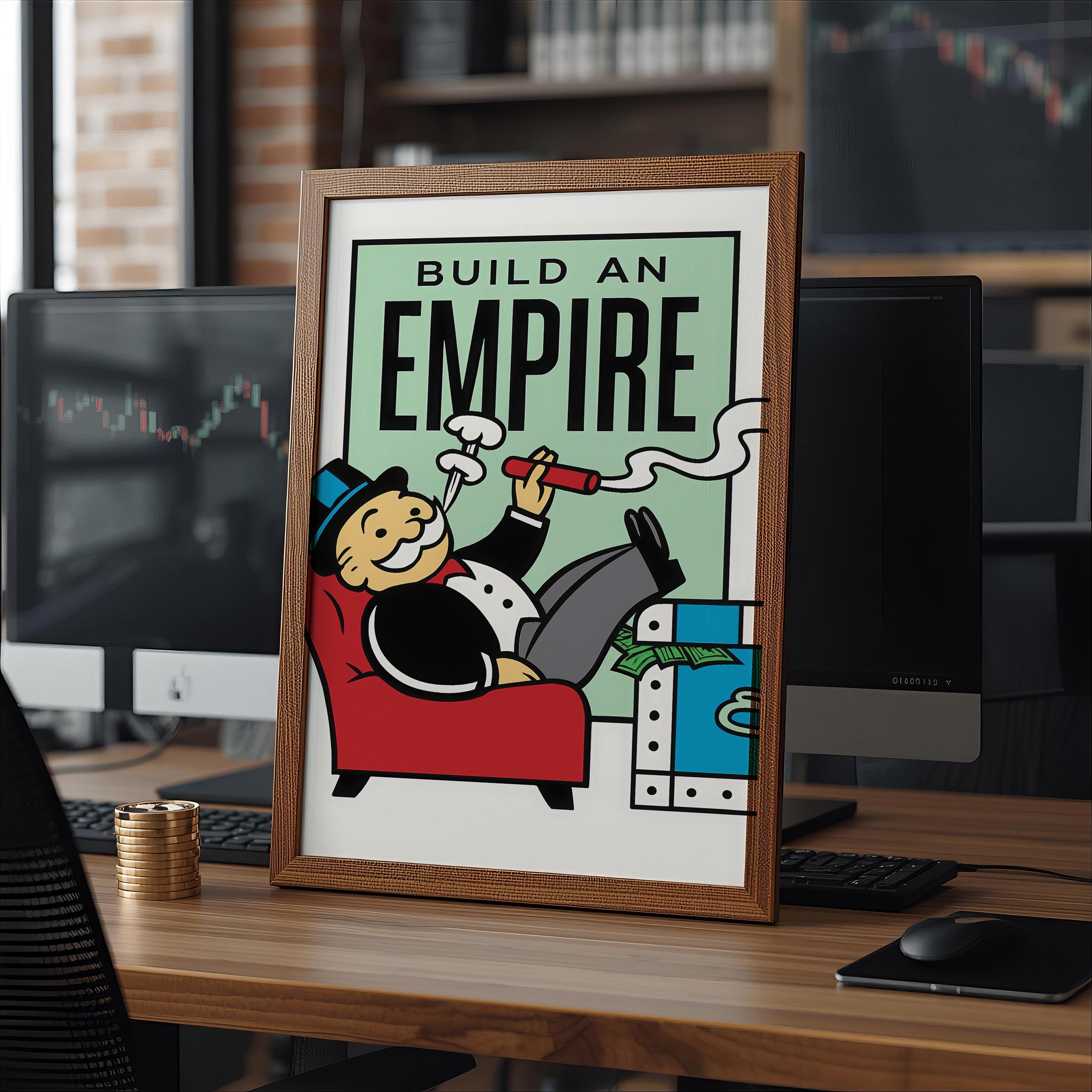 Bold, vintage-inspired poster art that celebrates ambition and hustle. The illustration shows a relaxed tycoon lounging with a cigar and chest of cash beneath the headline “BUILD AN EMPIRE.” Clean, saturated colors and strong lines give it a retro commercial-print vibe that reads confidently from across the room. Hung over a home office, studio wall, or beside a bookshelf, this poster becomes a daily nudge — a visual anthem for making moves and staying focused. Choose a textured fine art paper for gallery-worthy depth, semi-gloss for vibrant color pop, or matte for a softer, museum-like look. Available in multiple sizes and orientations so it fits your space and aesthetic.