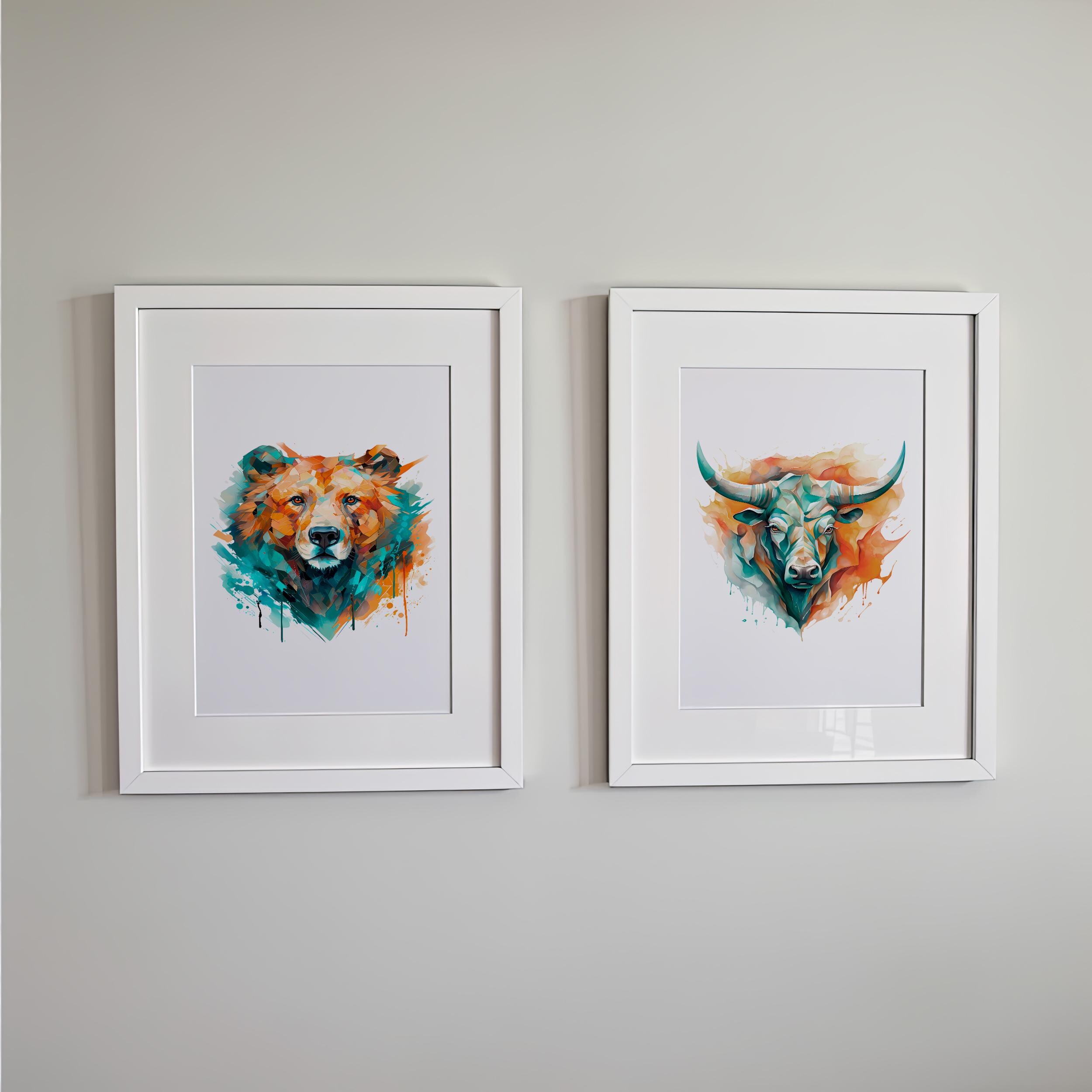 Each piece blends modern watercolor effects with the bold symbolism of bullish optimism and bearish caution, creating a perfect centerpiece for traders and investors.