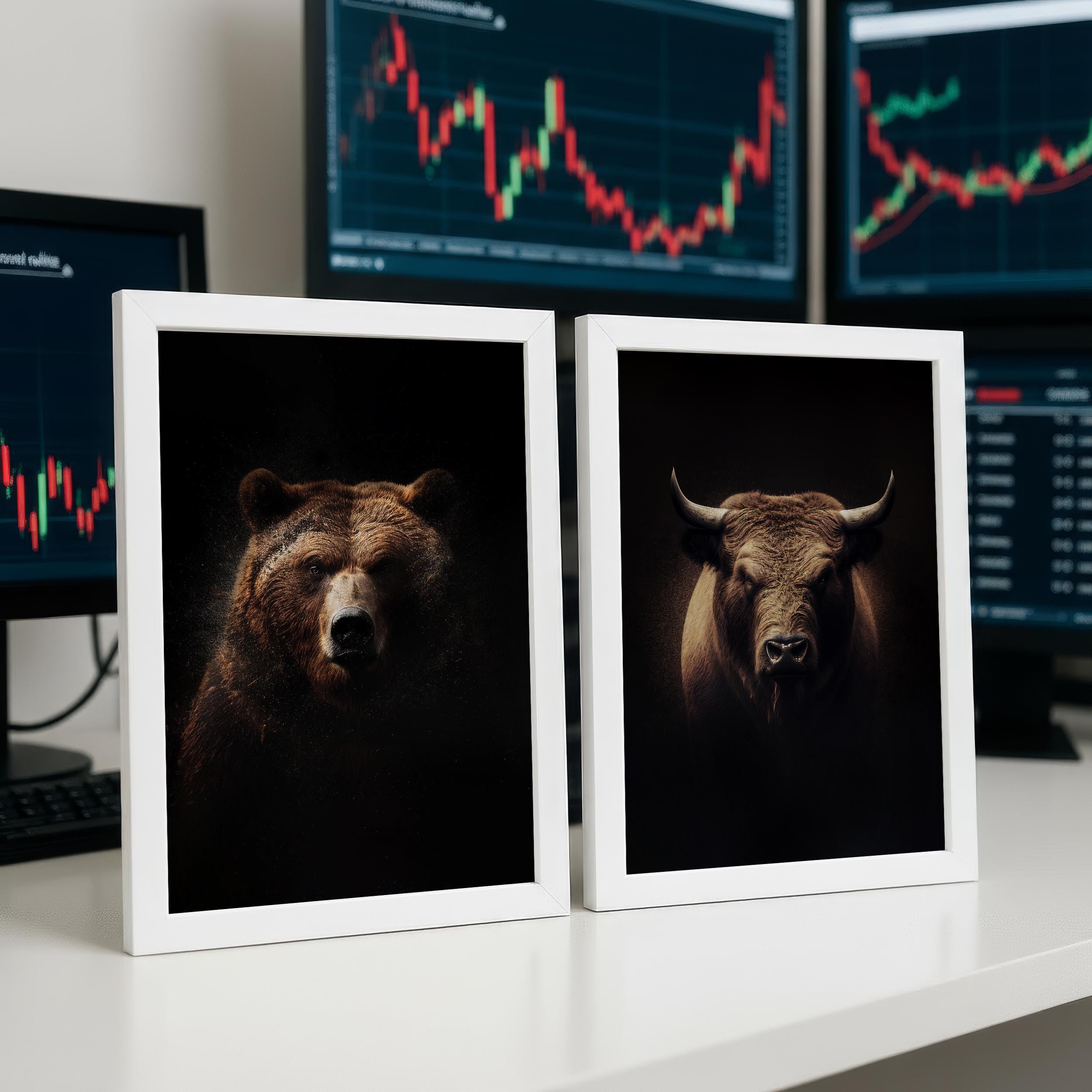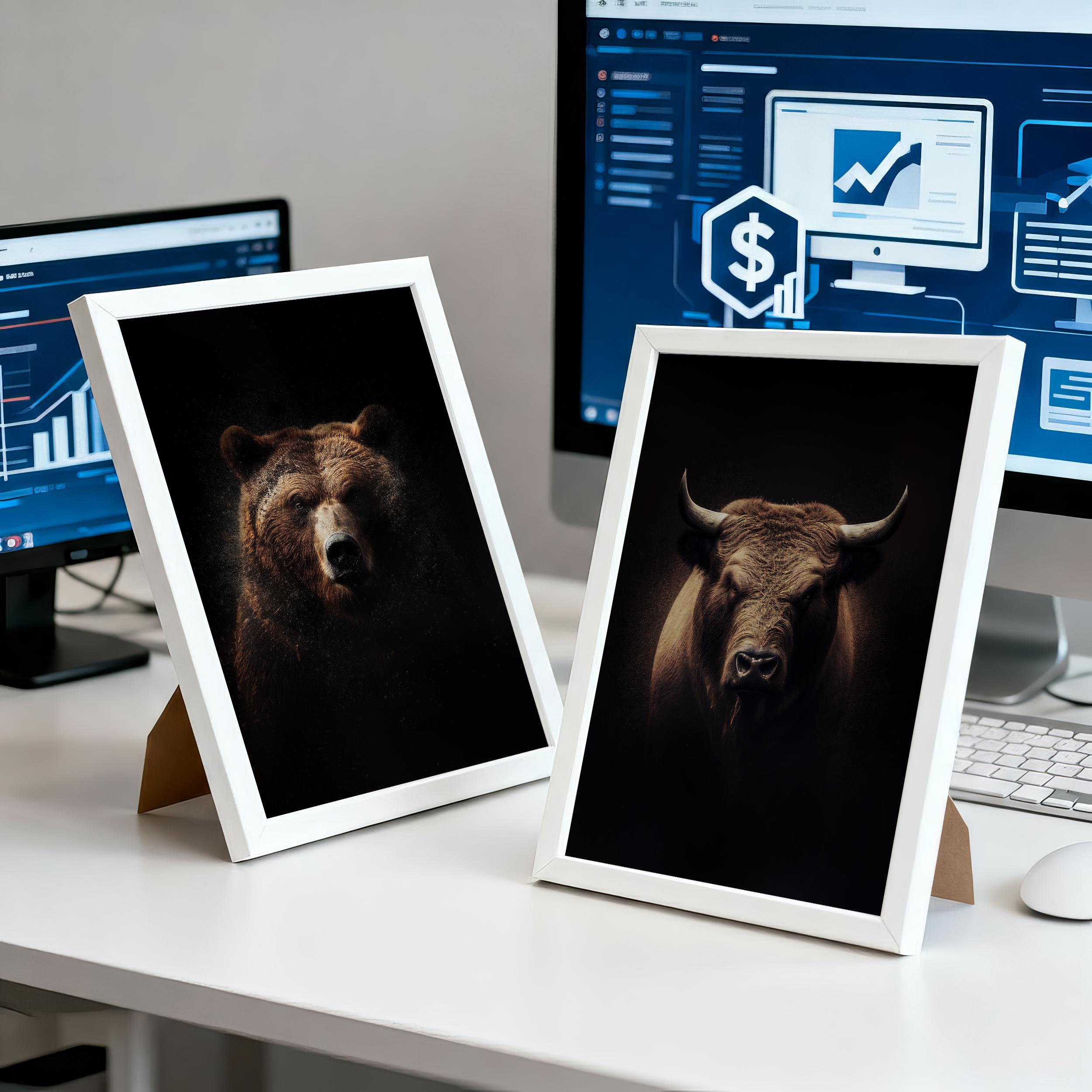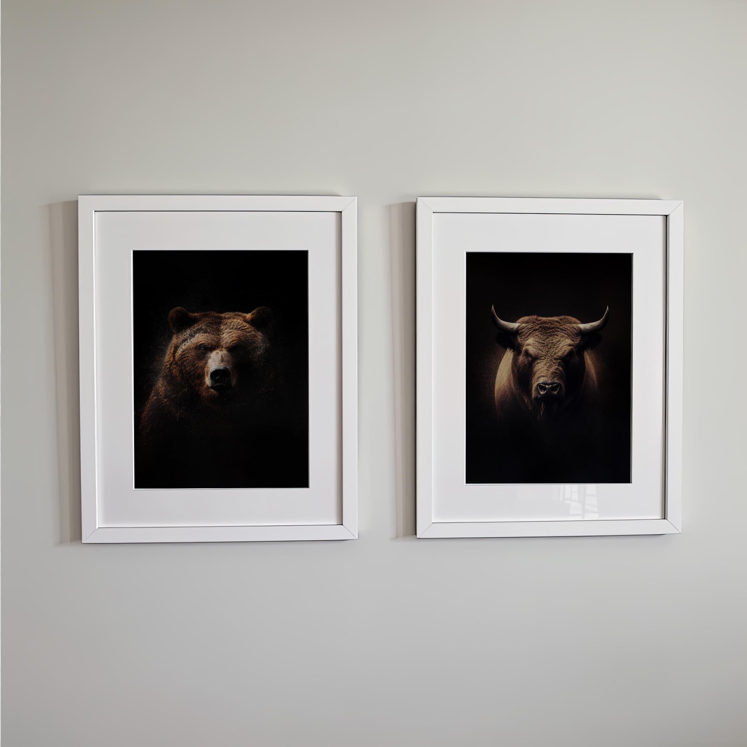 Command your workspace with the strength and confidence of this Realistic Bull and Bear Fine Art Print Set.