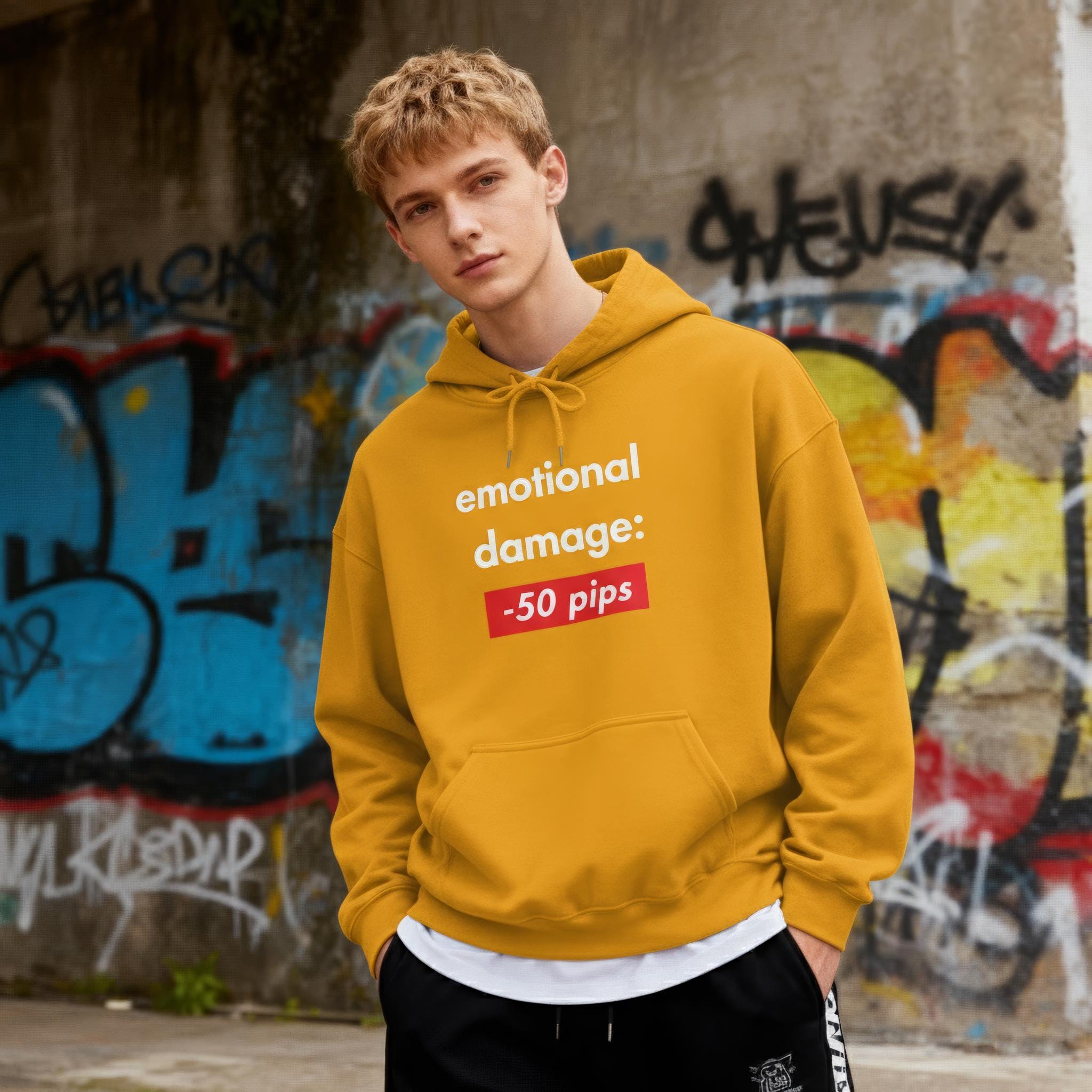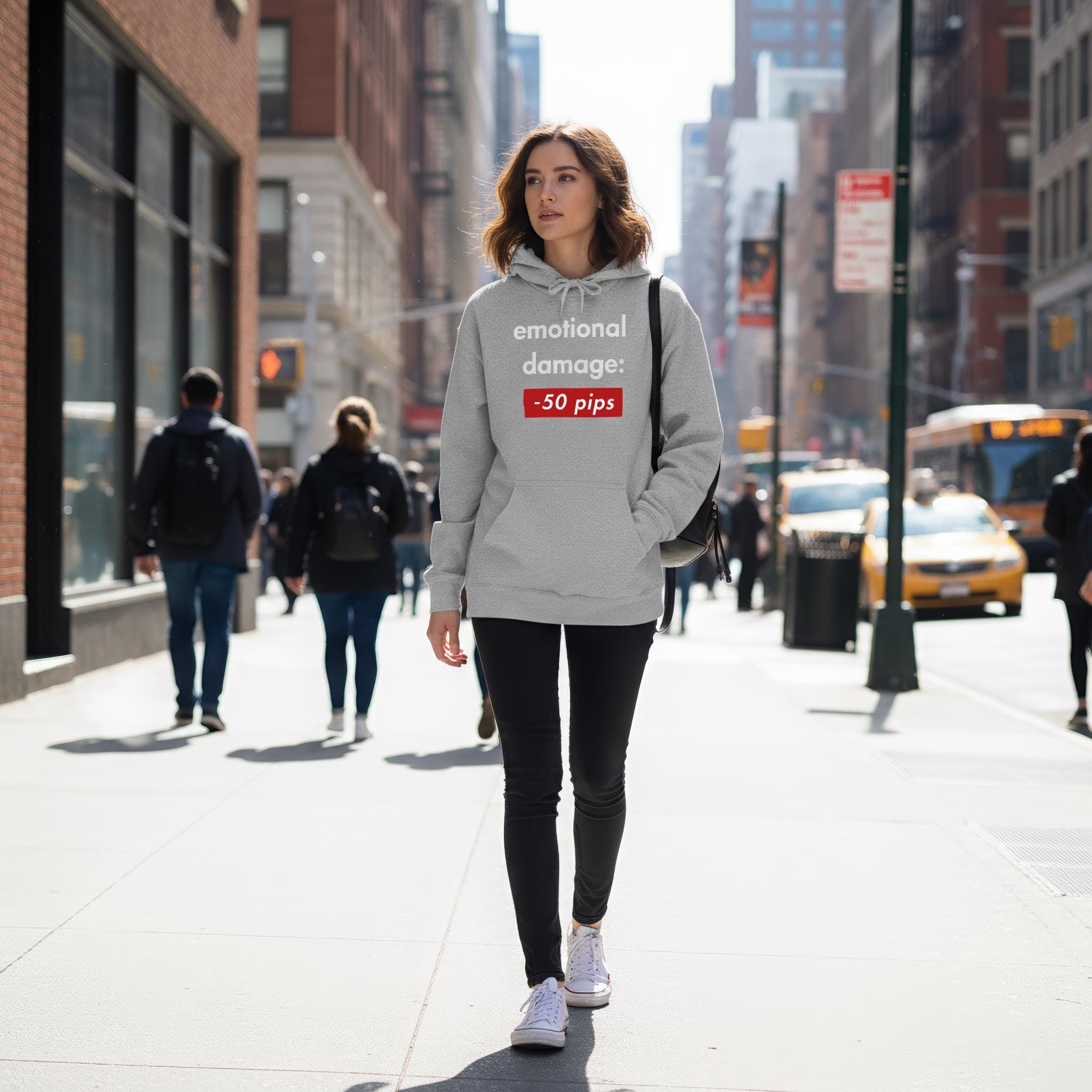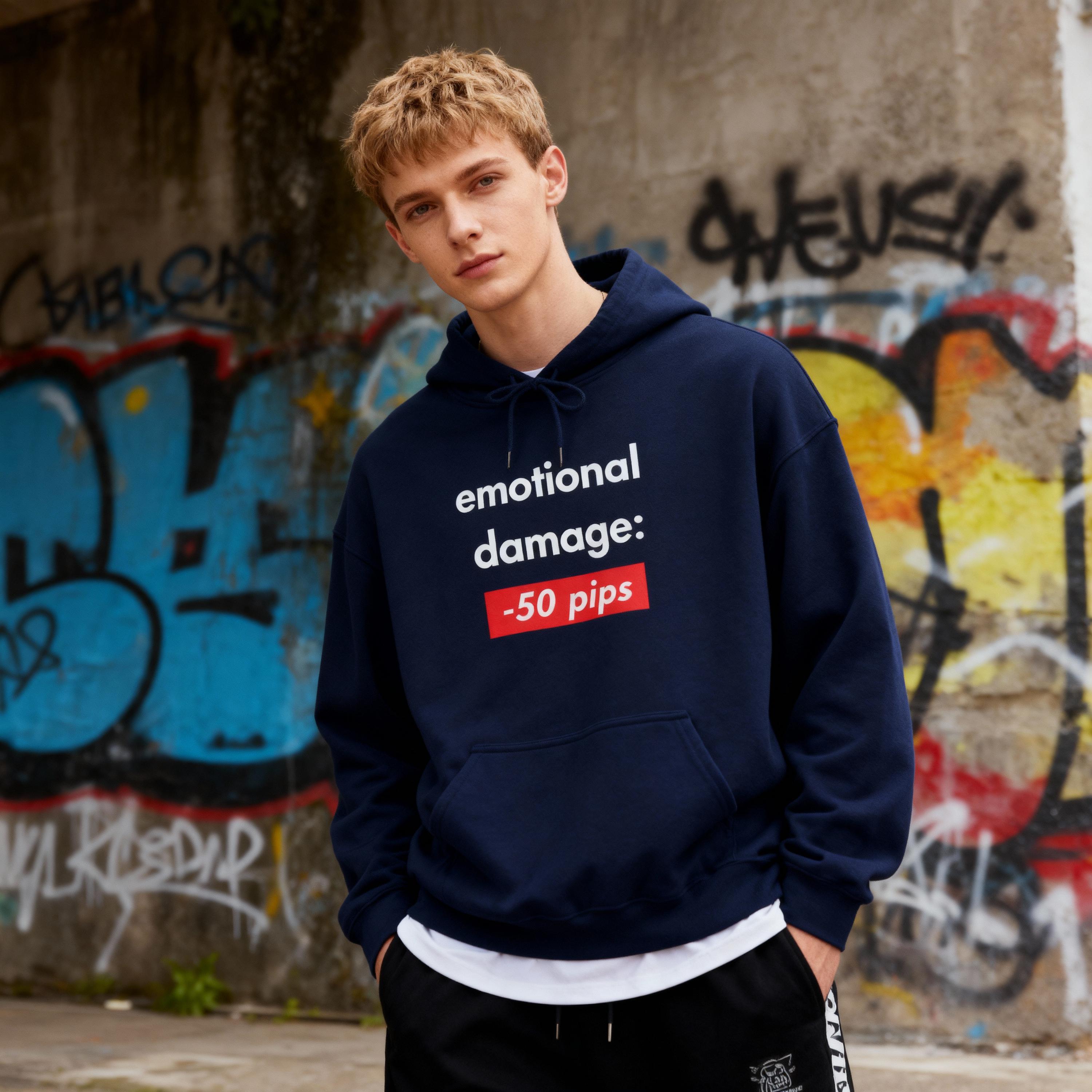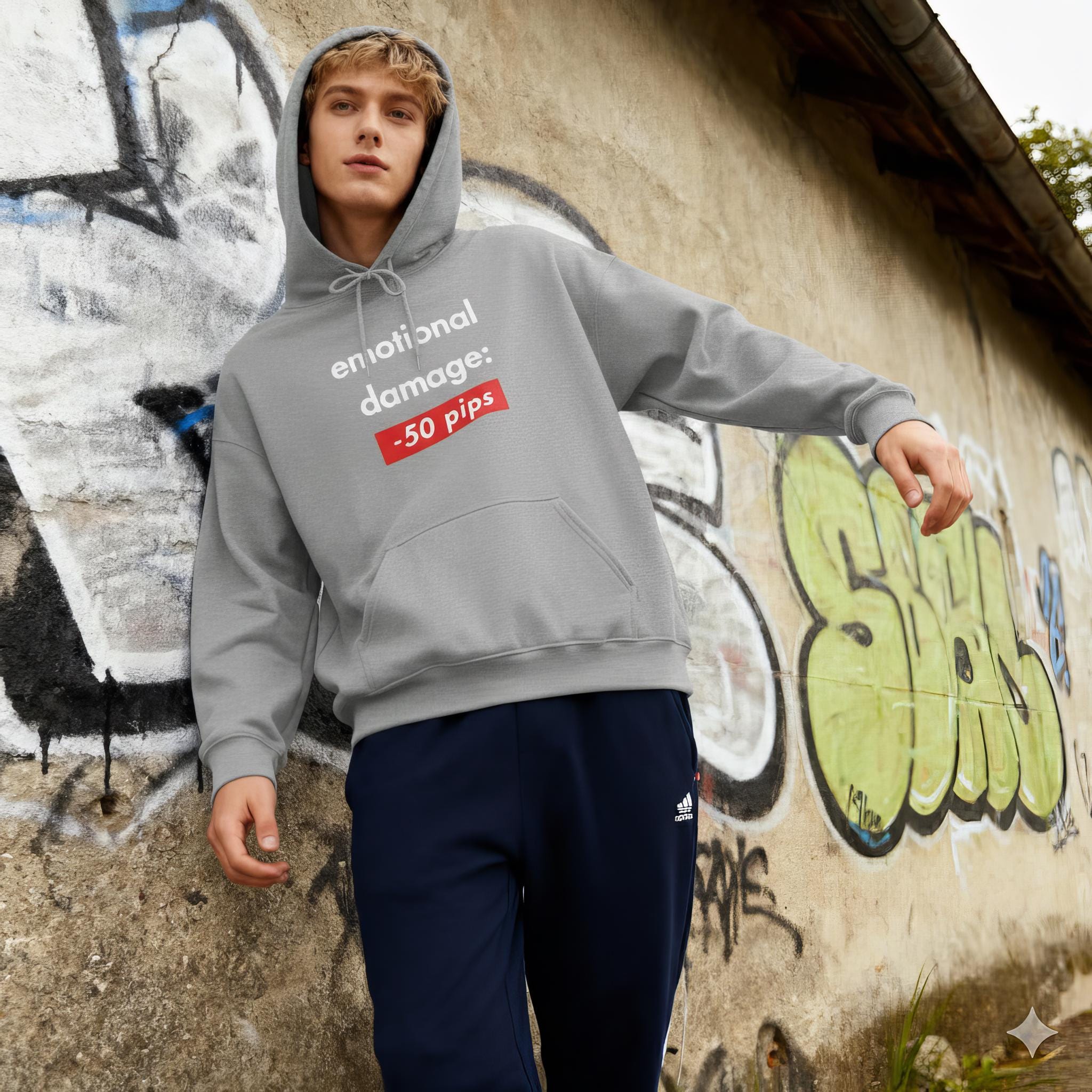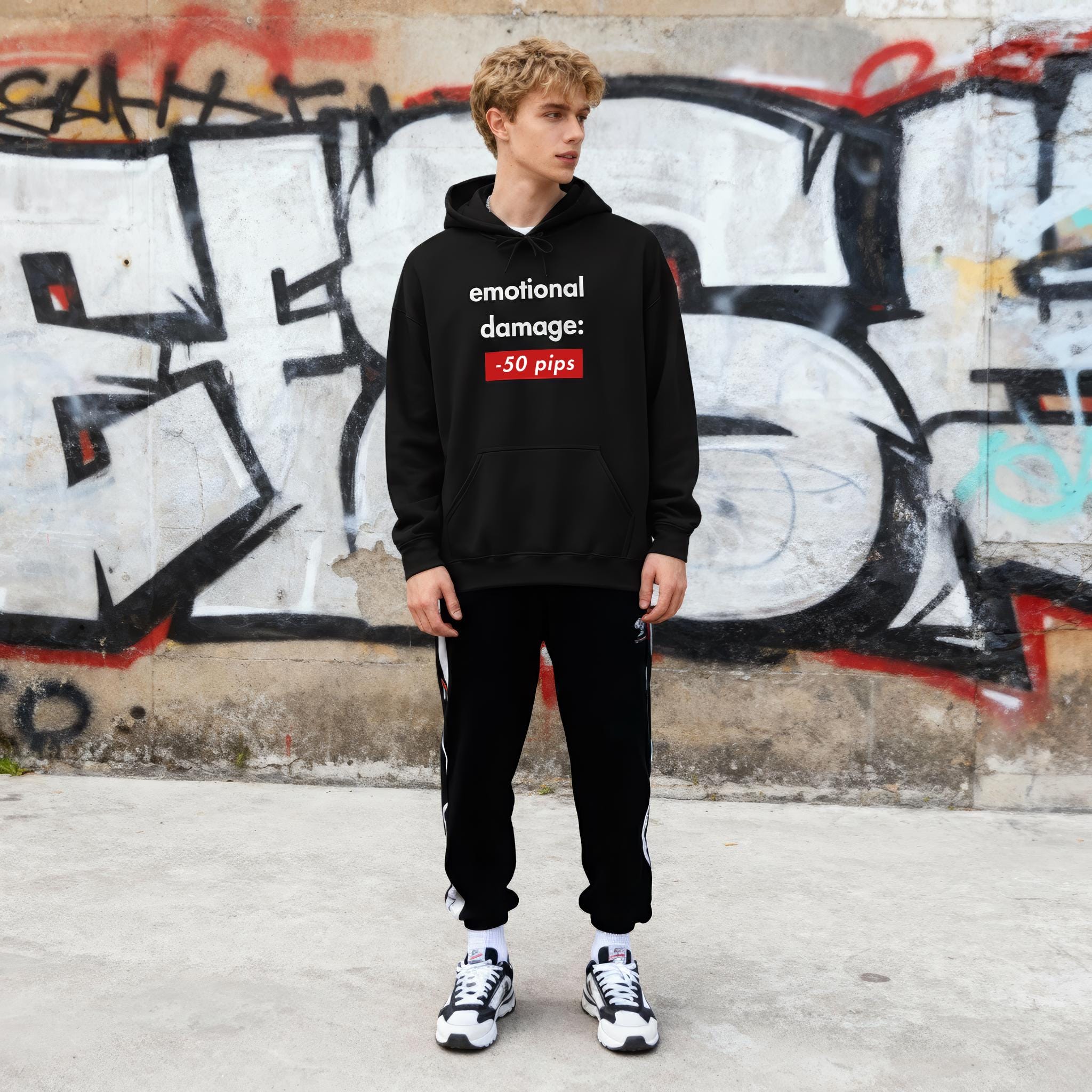 This cozy hooded sweatshirt speaks the language of traders and anyone who counts gains and losses in pips. Soft, medium-heavy fleece and a roomy kangaroo pocket make it a go-to layer for late nights at the desk or quick coffee breaks between charts. The front print reads “emotional damage: -50 pips” with a bold red indicator — a dry, self-aware nod to the stress and humor of trading life. Wear it while reviewing charts, sharing war stories with other traders, or simply when you need a little sartorial therapy after a rough session. The double-lined hood and color-matched drawcord keep the look clean and understated, so the message stays the focus.