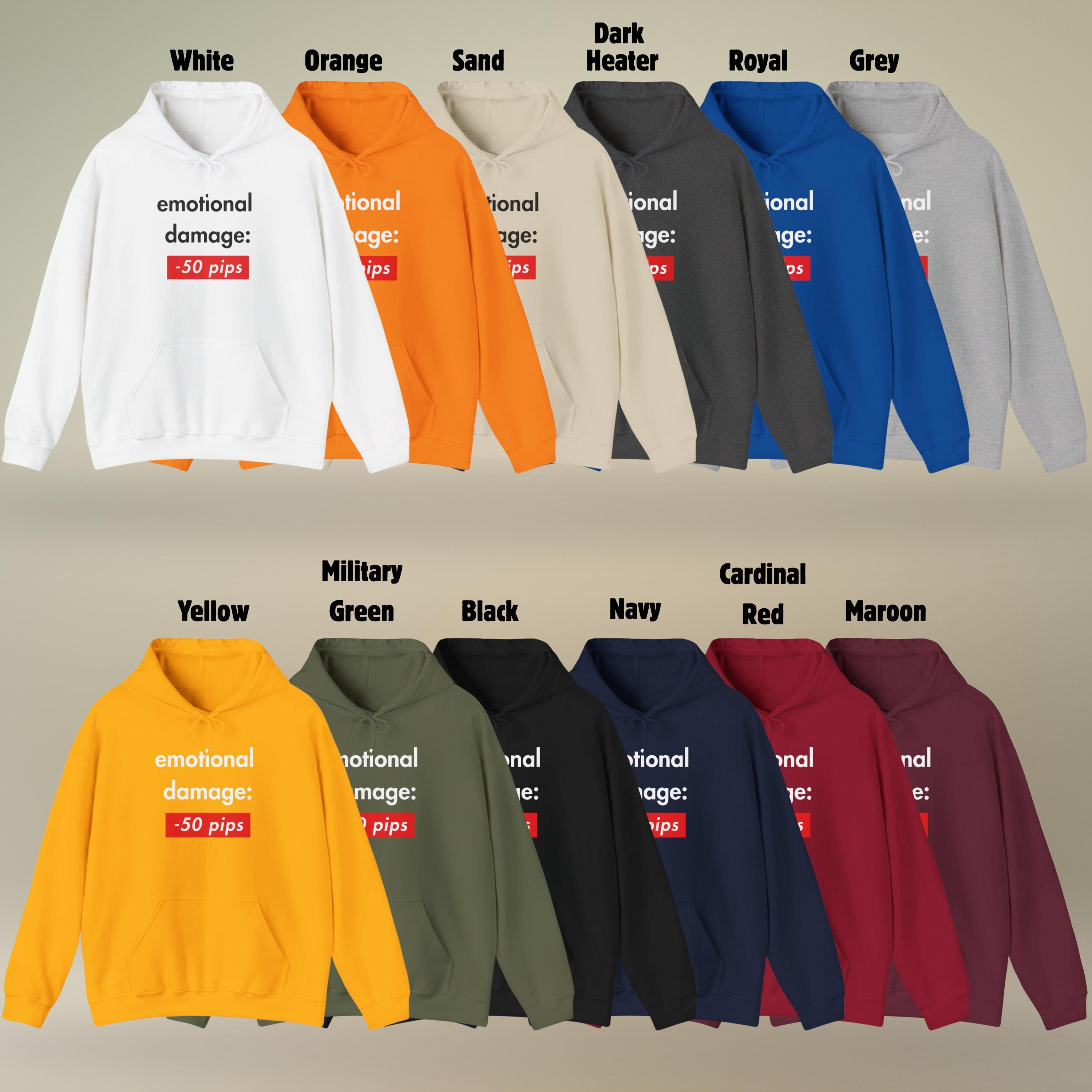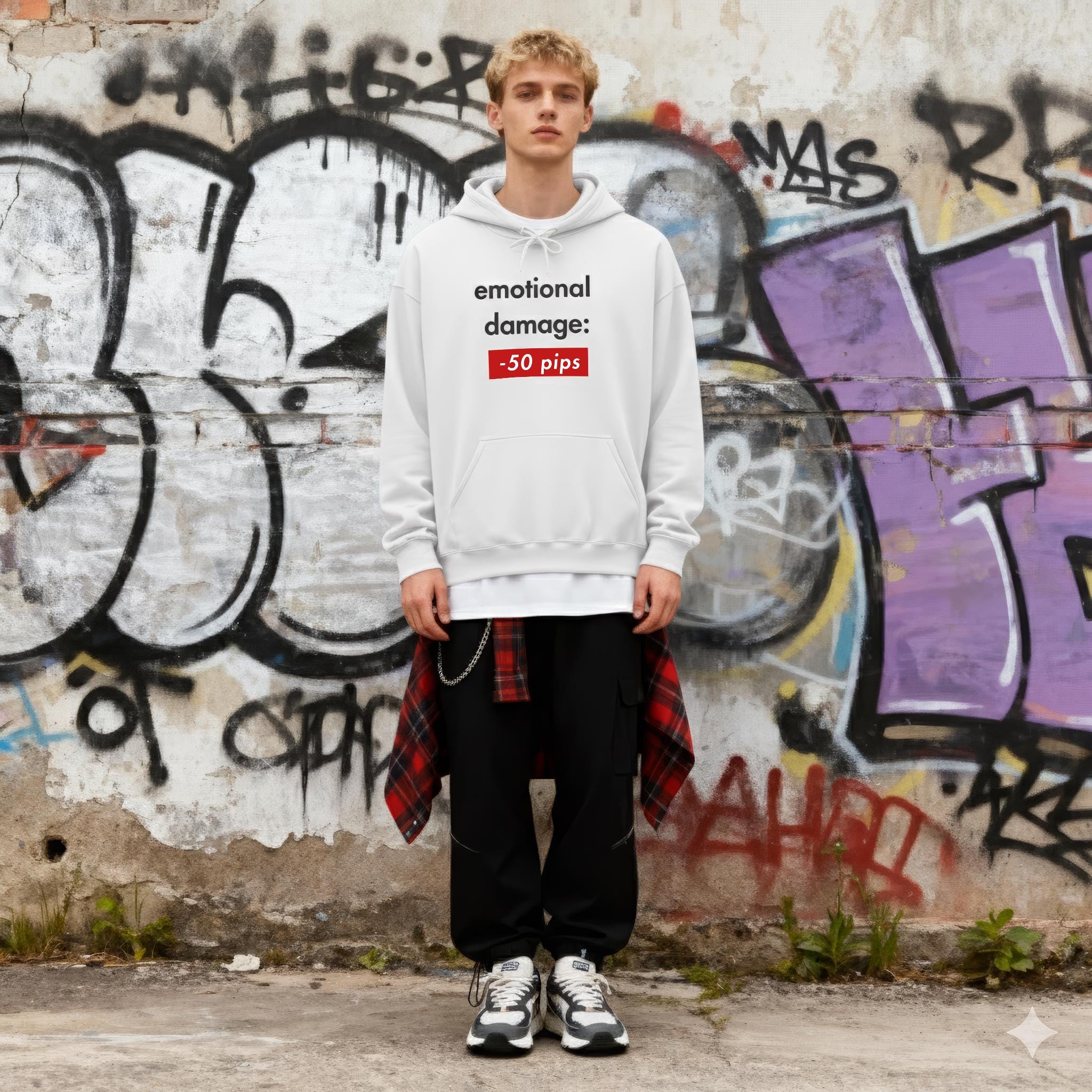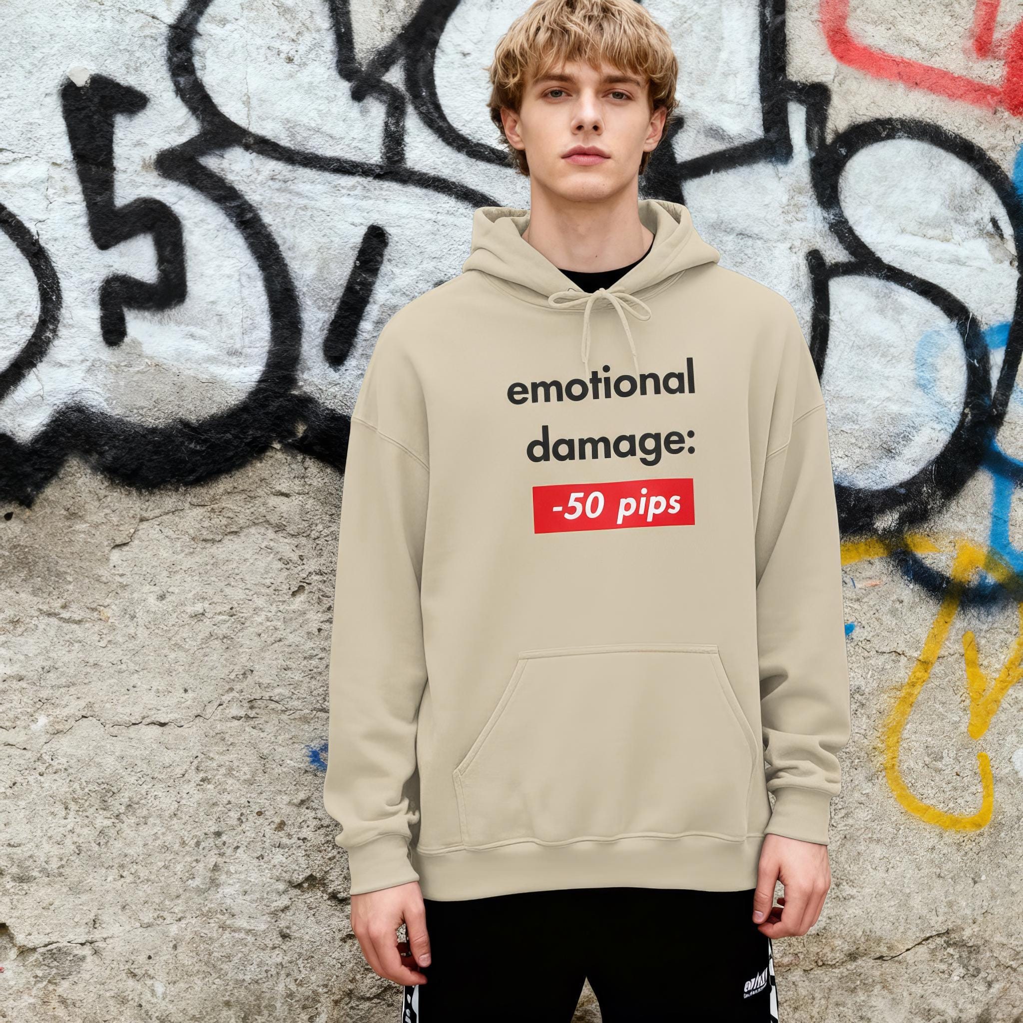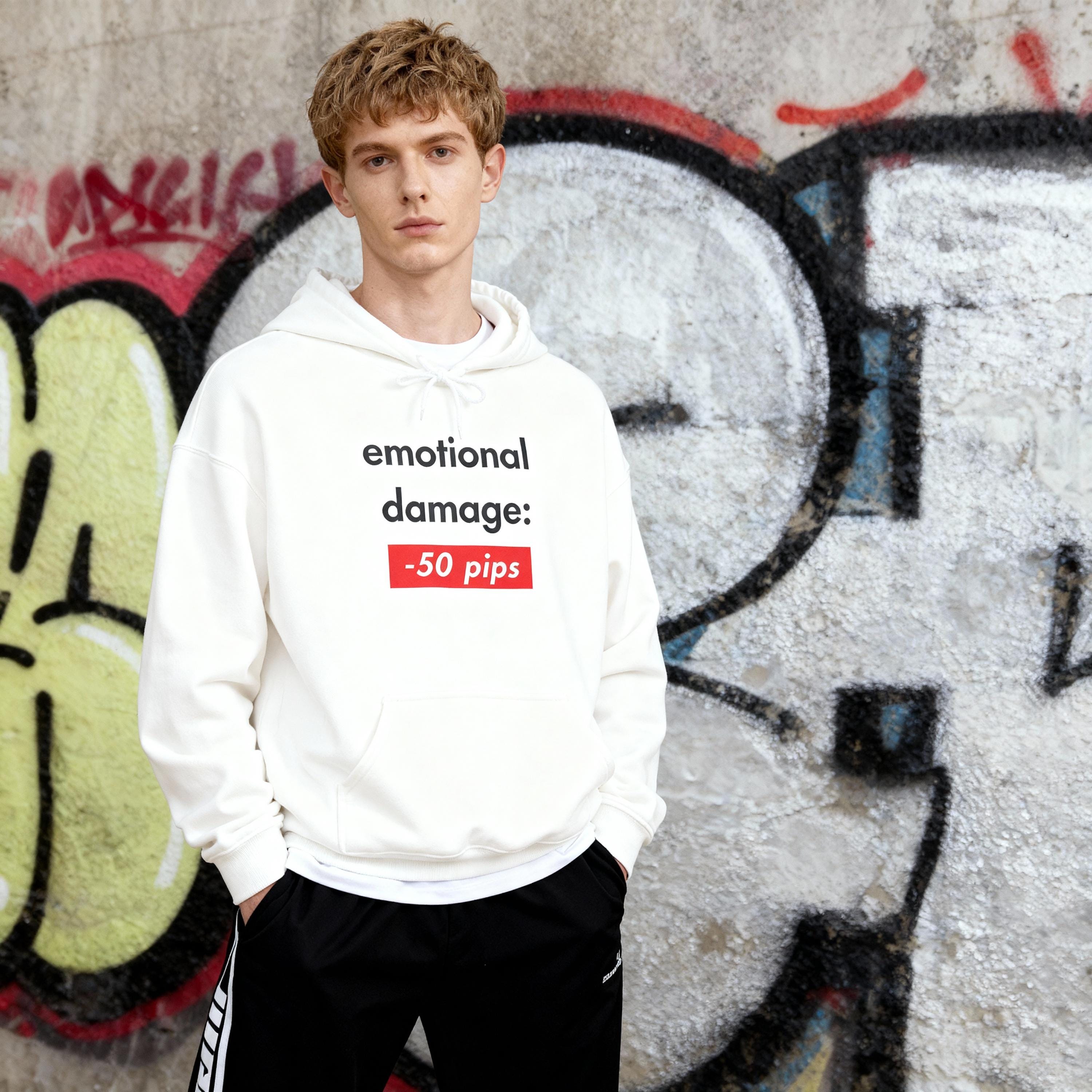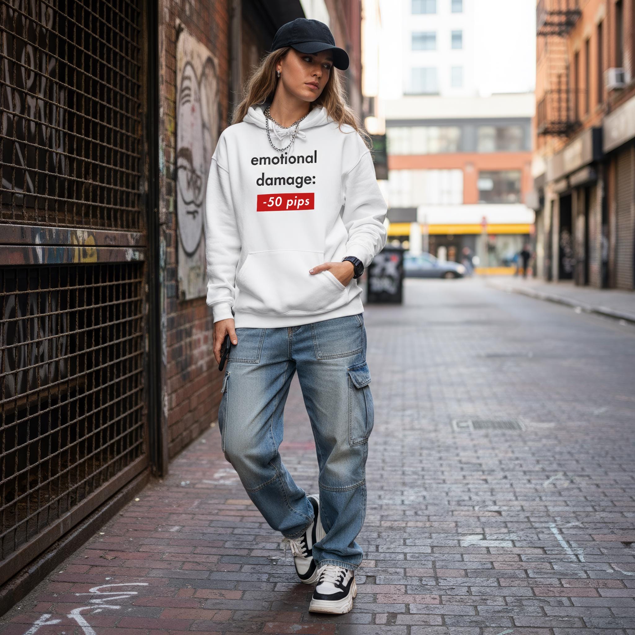 This cozy hooded sweatshirt speaks the language of traders and anyone who counts gains and losses in pips. Soft, medium-heavy fleece and a roomy kangaroo pocket make it a go-to layer for late nights at the desk or quick coffee breaks between charts. The front print reads “emotional damage: -50 pips” with a bold red indicator — a dry, self-aware nod to the stress and humor of trading life. Wear it while reviewing charts, sharing war stories with other traders, or simply when you need a little sartorial therapy after a rough session. The double-lined hood and color-matched drawcord keep the look clean and understated, so the message stays the focus.