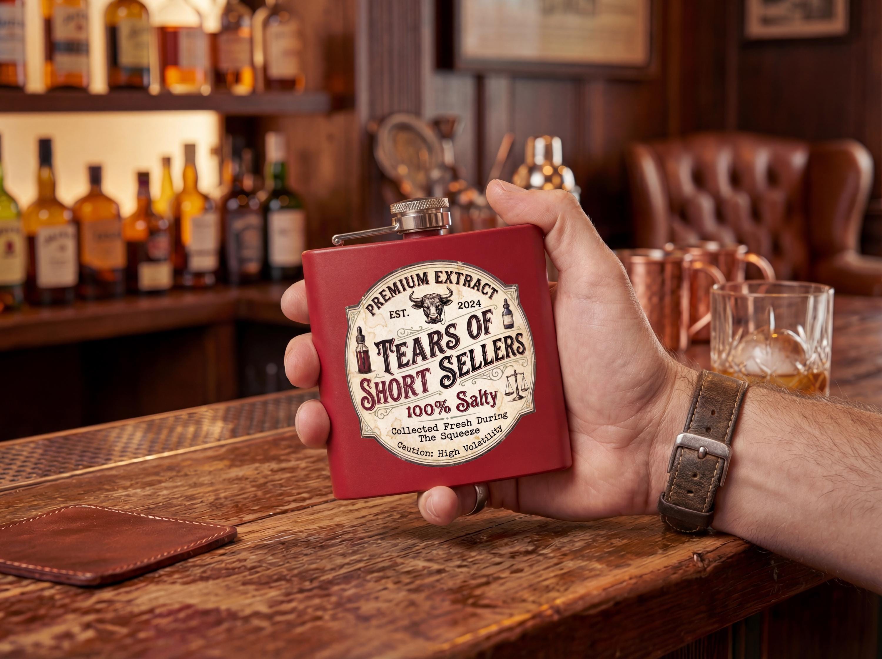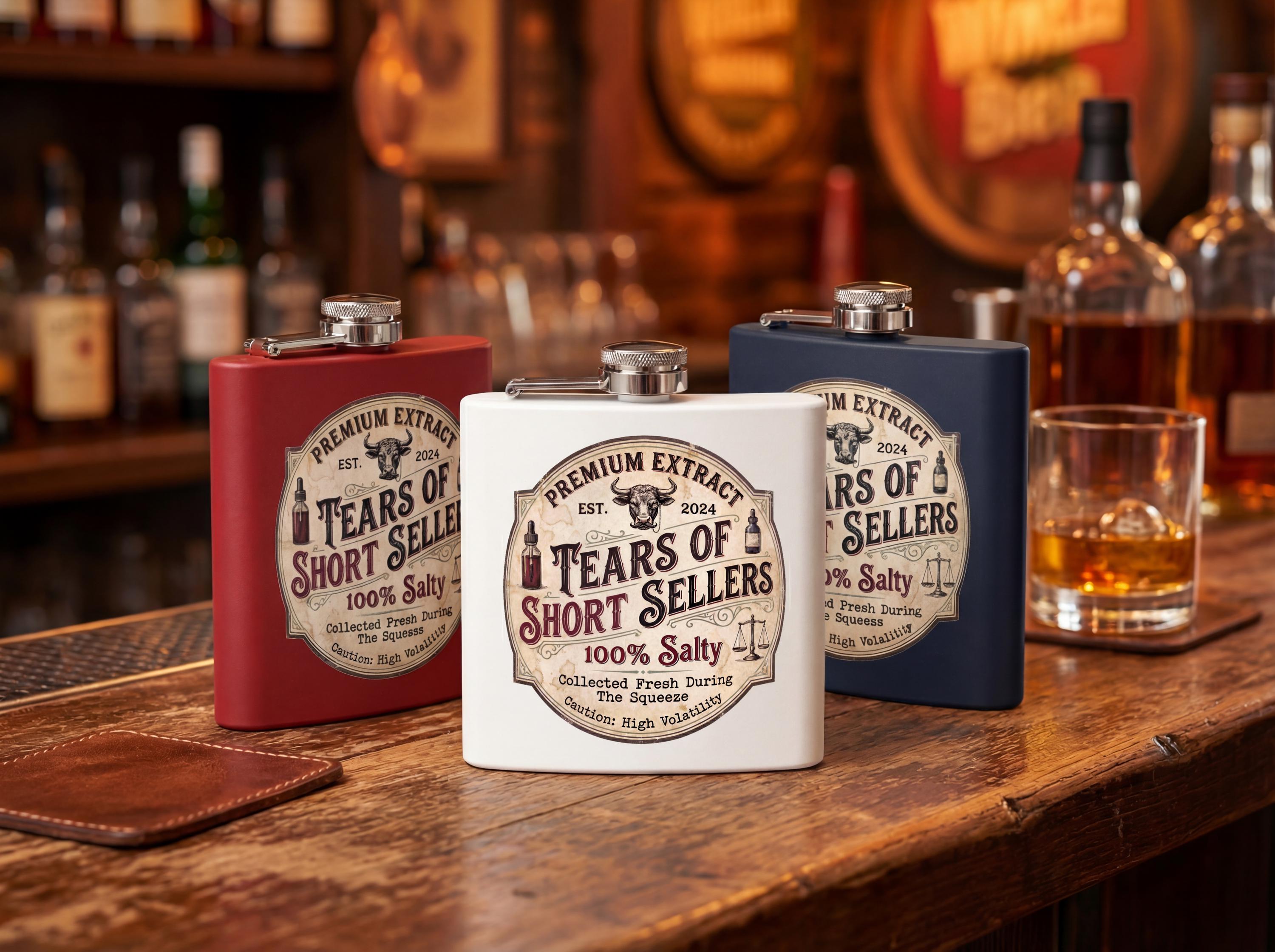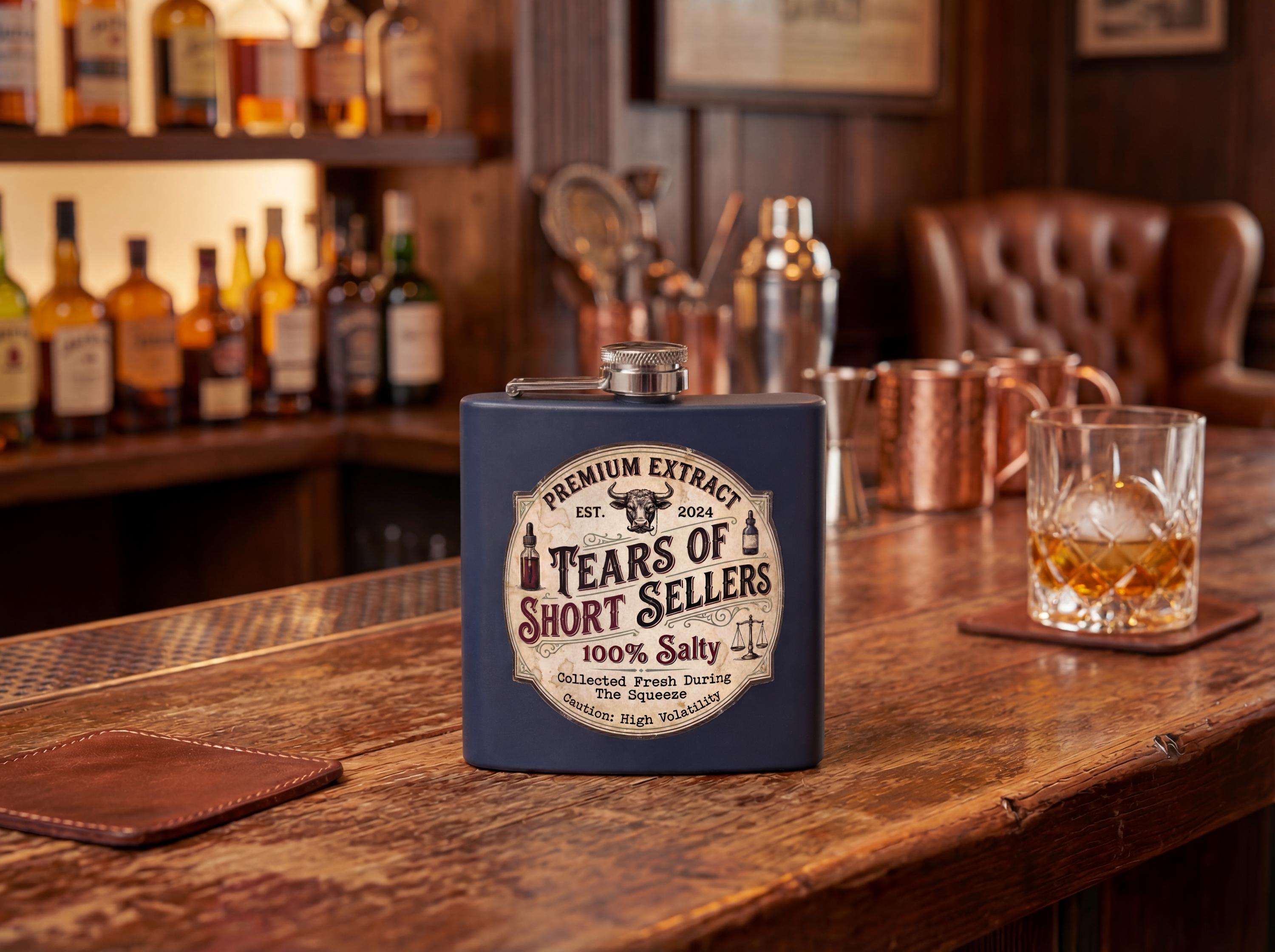Featuring a vintage-style label with the phrase “Tears of Short Sellers – 100% Salty”, this flask is a perfect conversation starter and a bold gift for bullish minds.