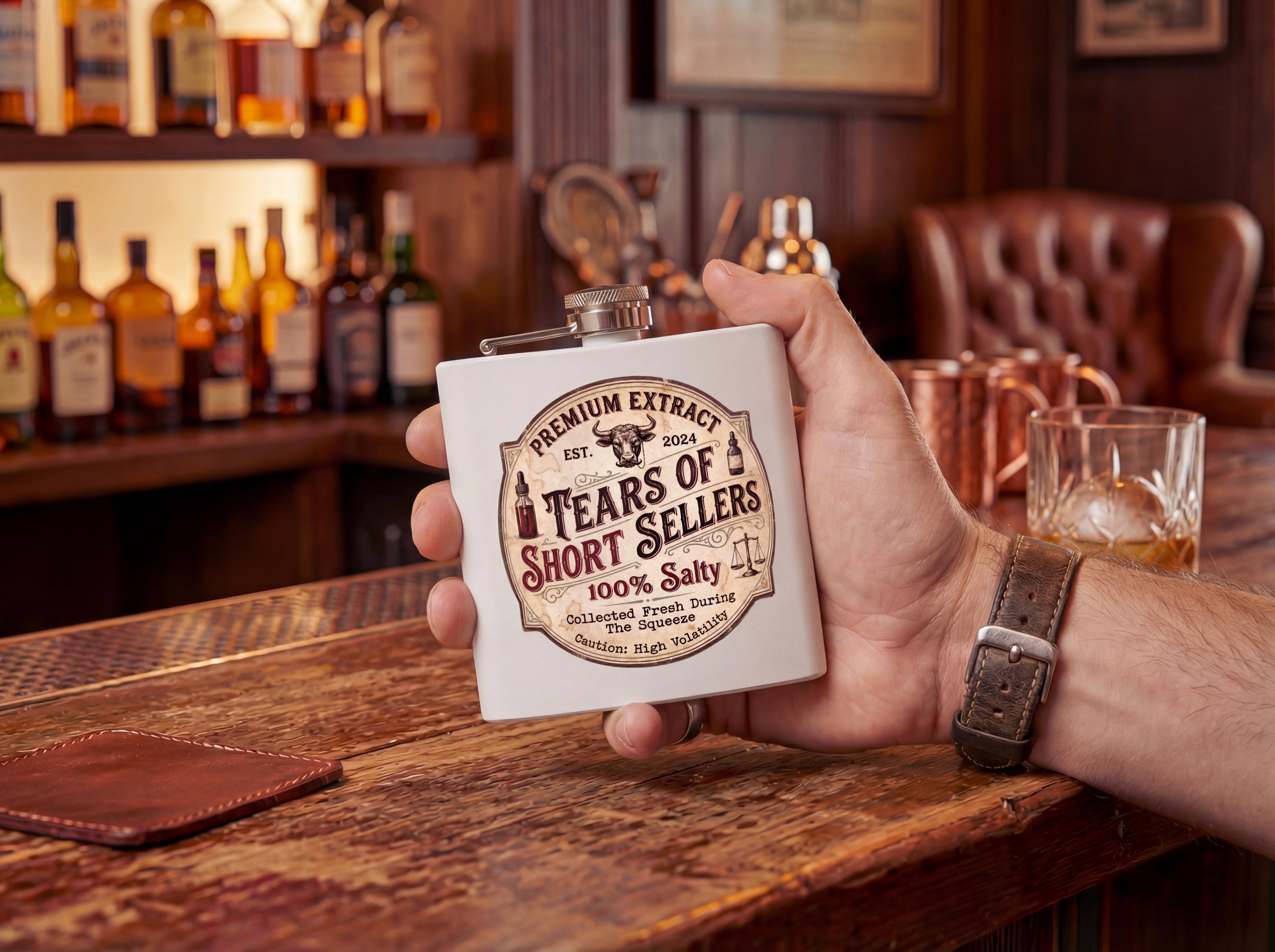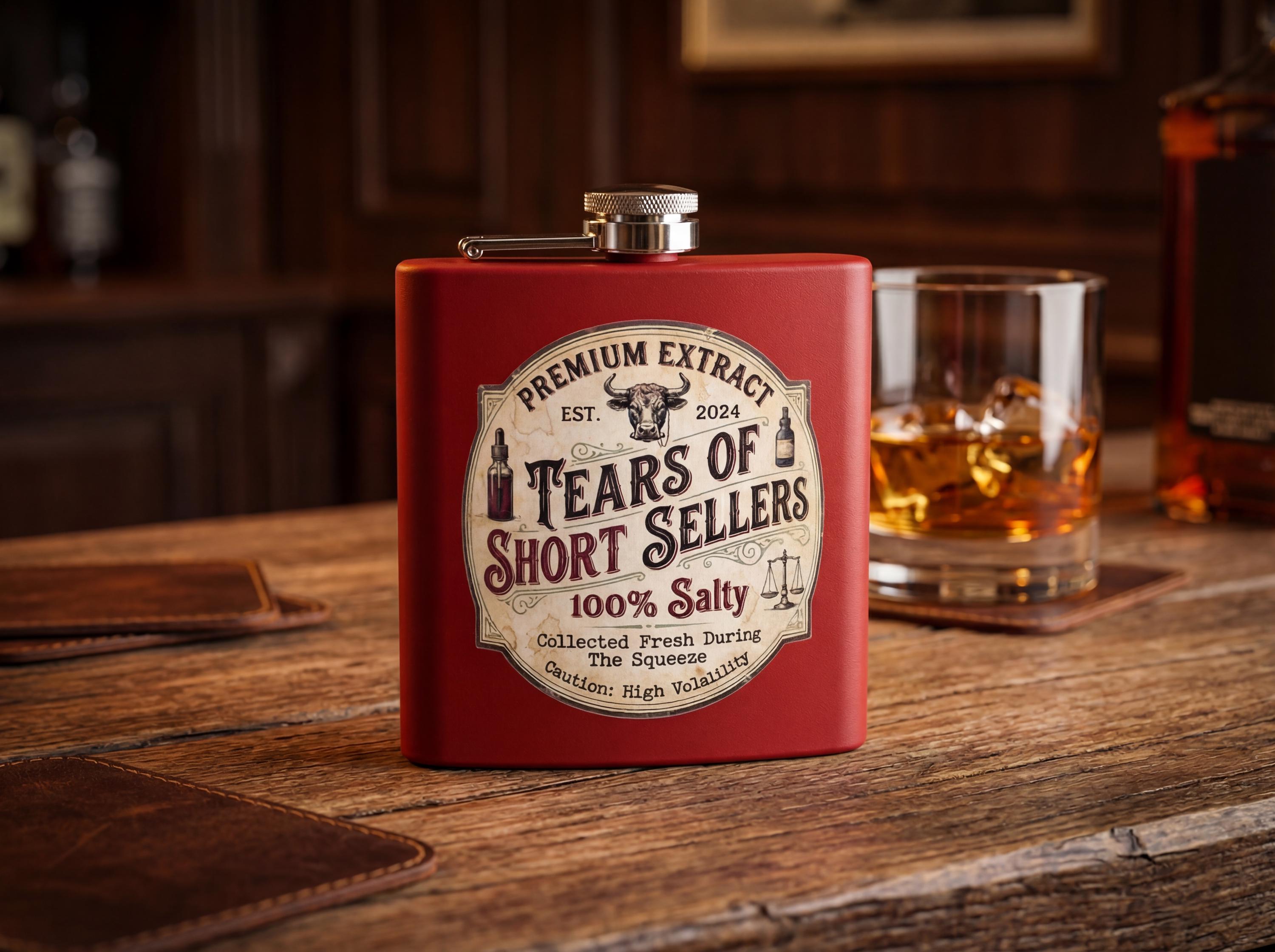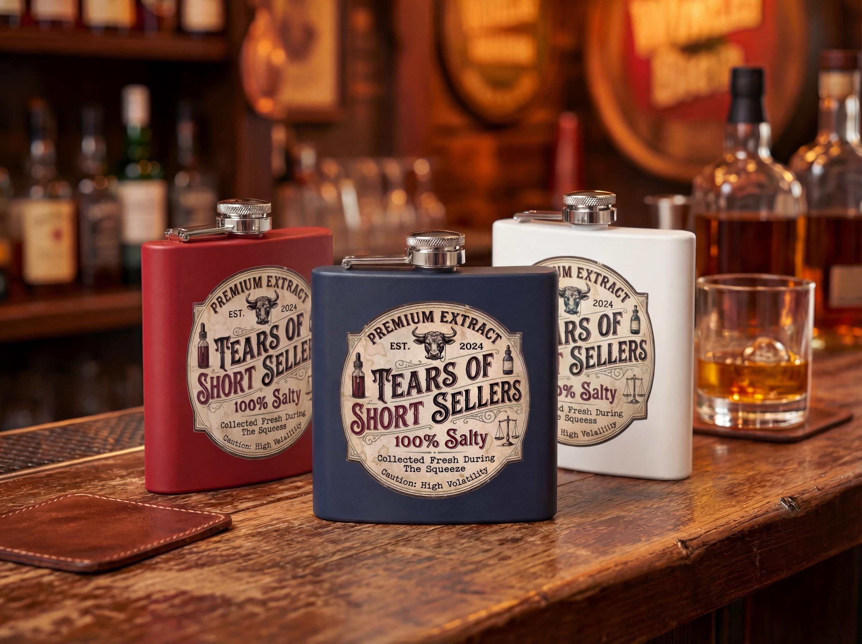 Featuring a vintage-style label with the phrase “Tears of Short Sellers – 100% Salty”, this flask is a perfect conversation starter and a bold gift for bullish minds.