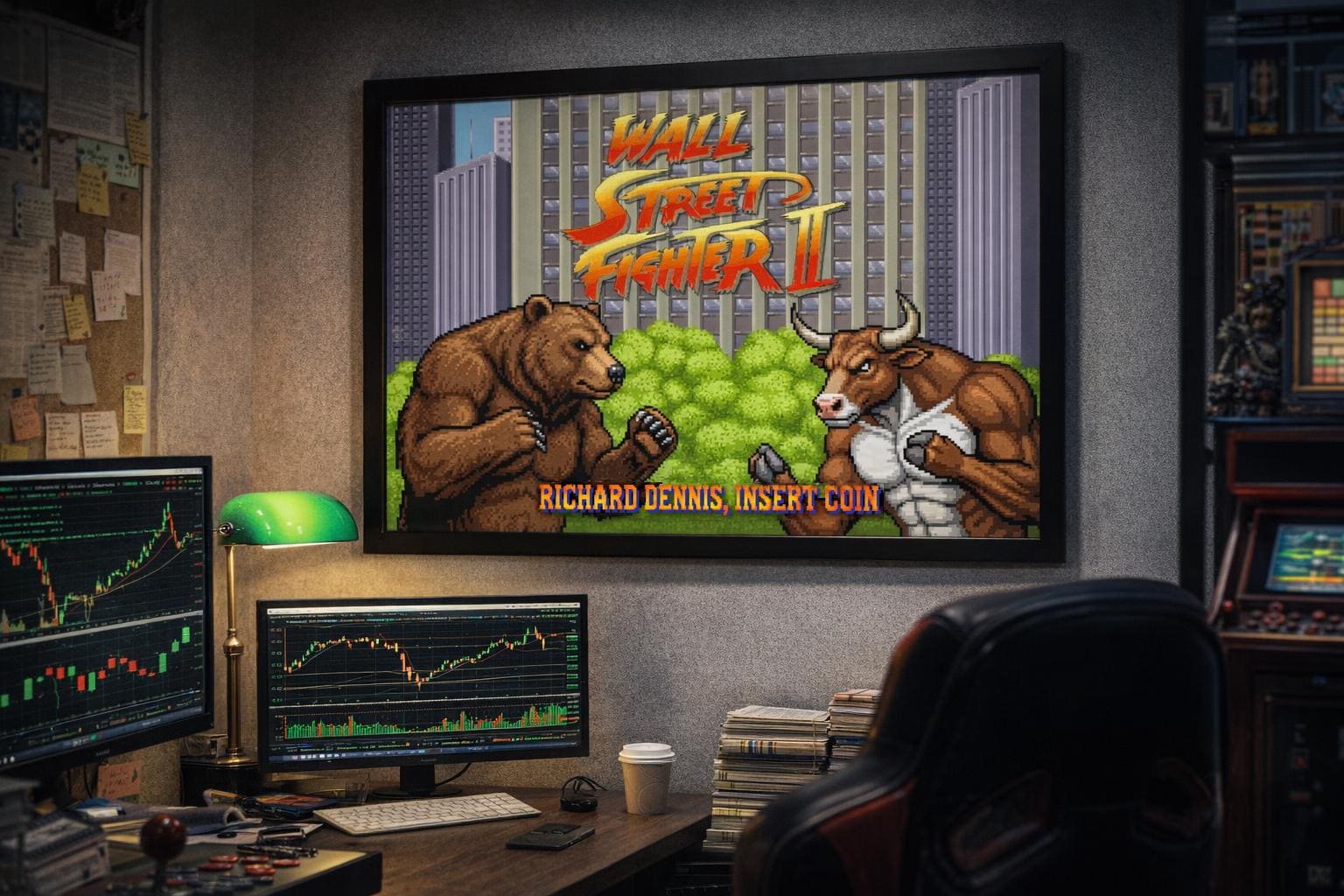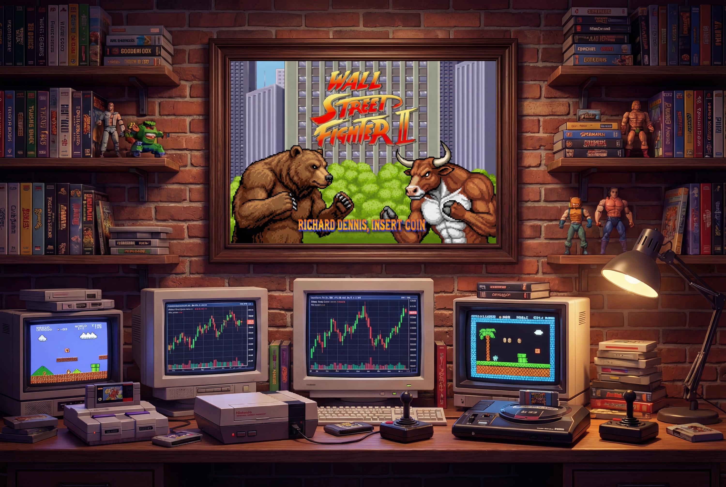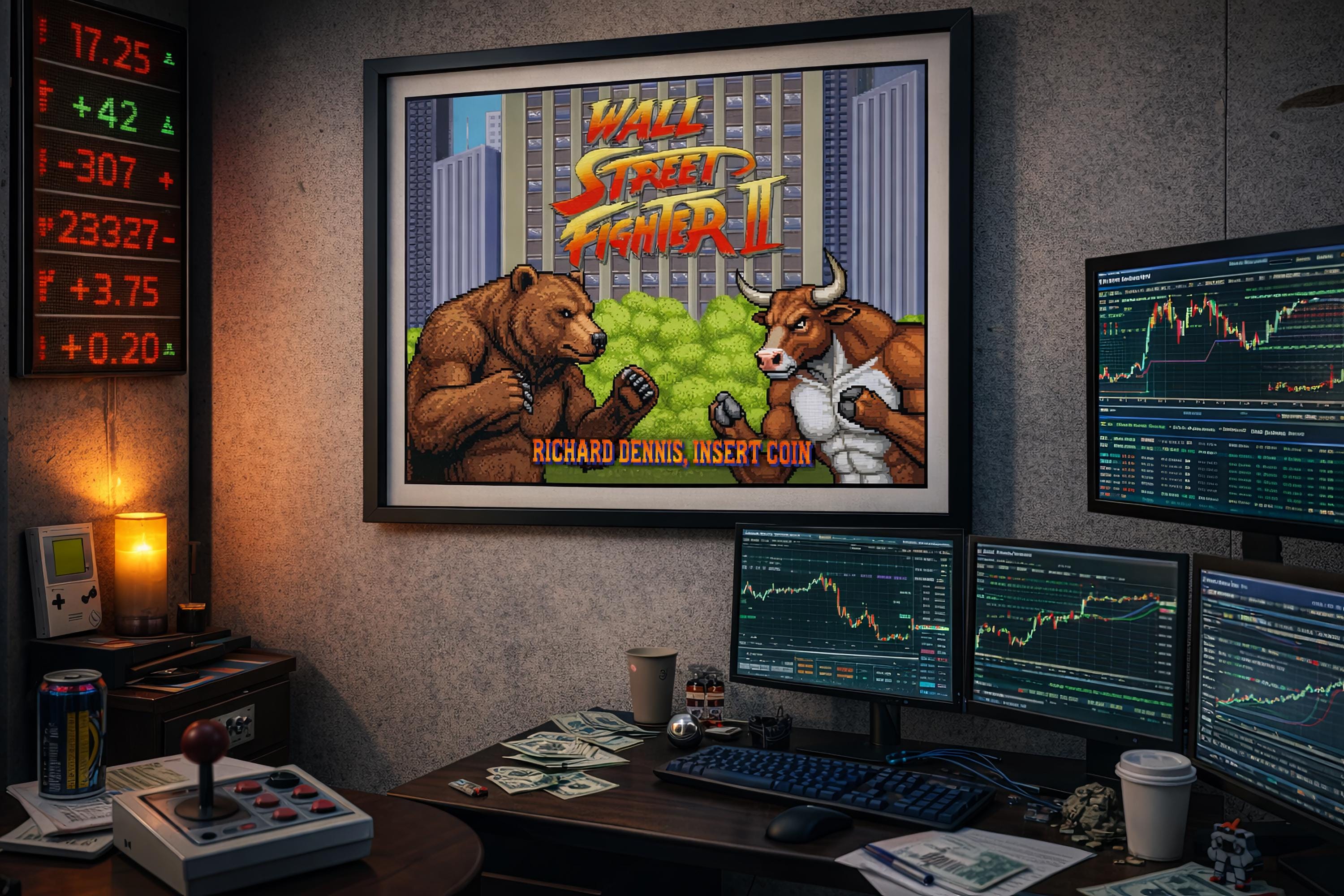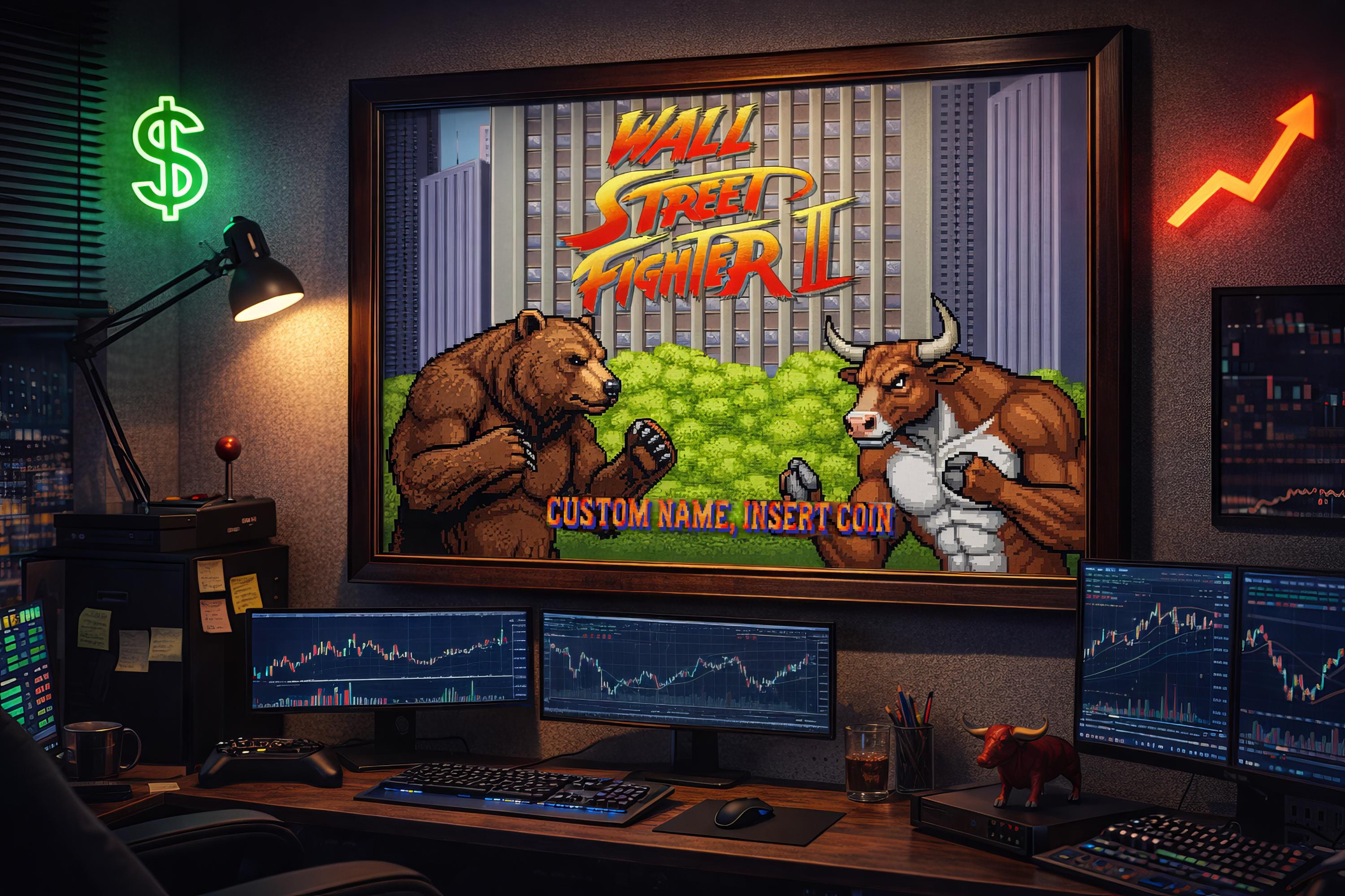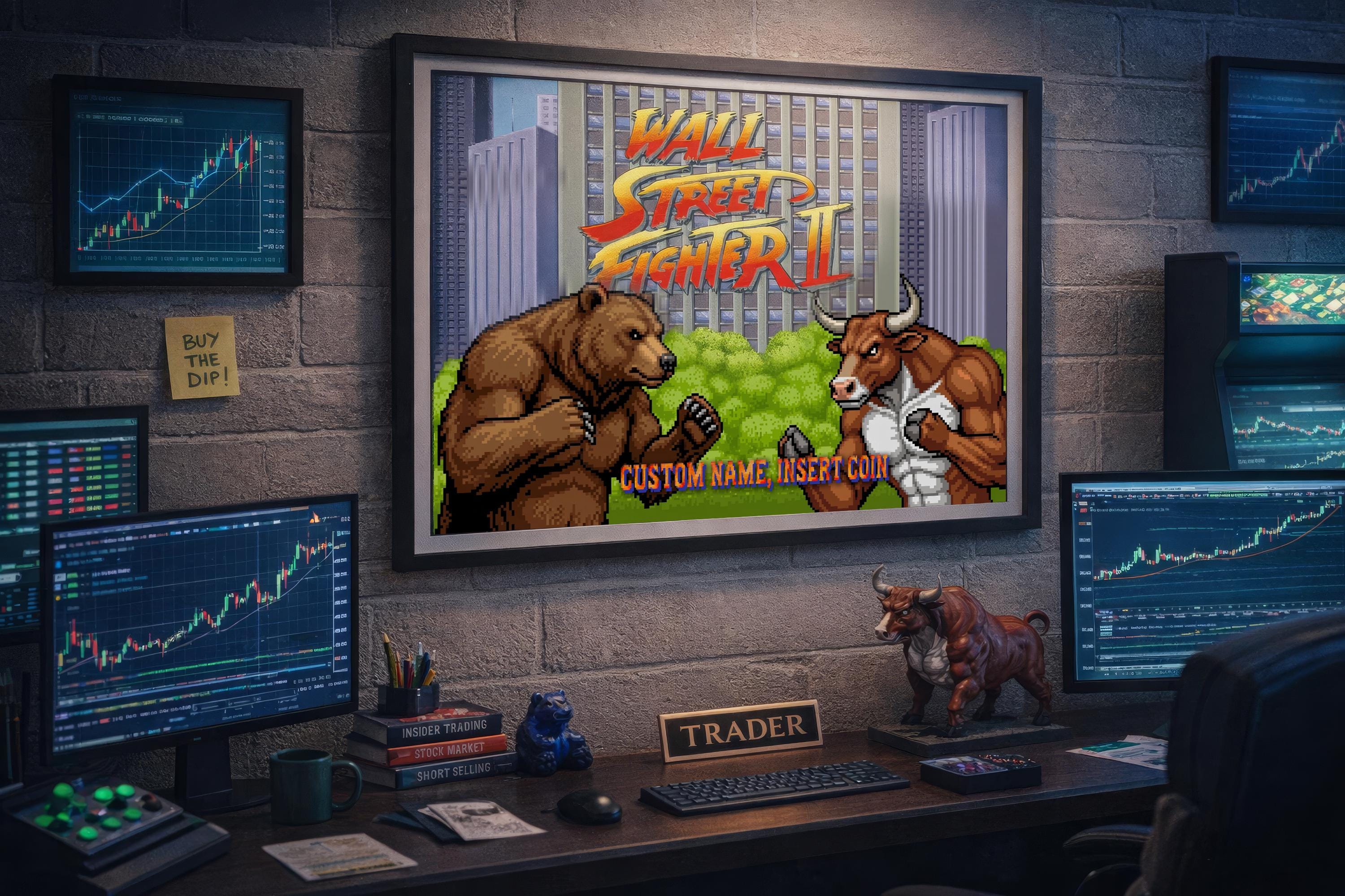 Inspired by the golden era of retro arcade fighters, this original artwork blends nostalgic pixel visuals with market symbolism — bulls vs bears — and a customizable arcade-style name area.