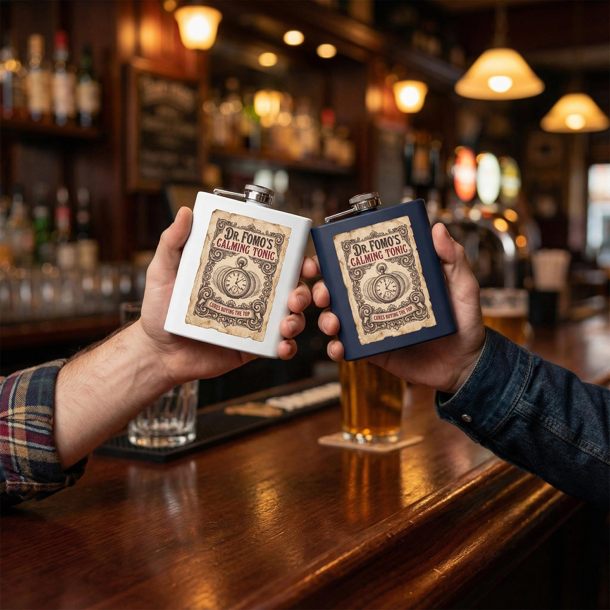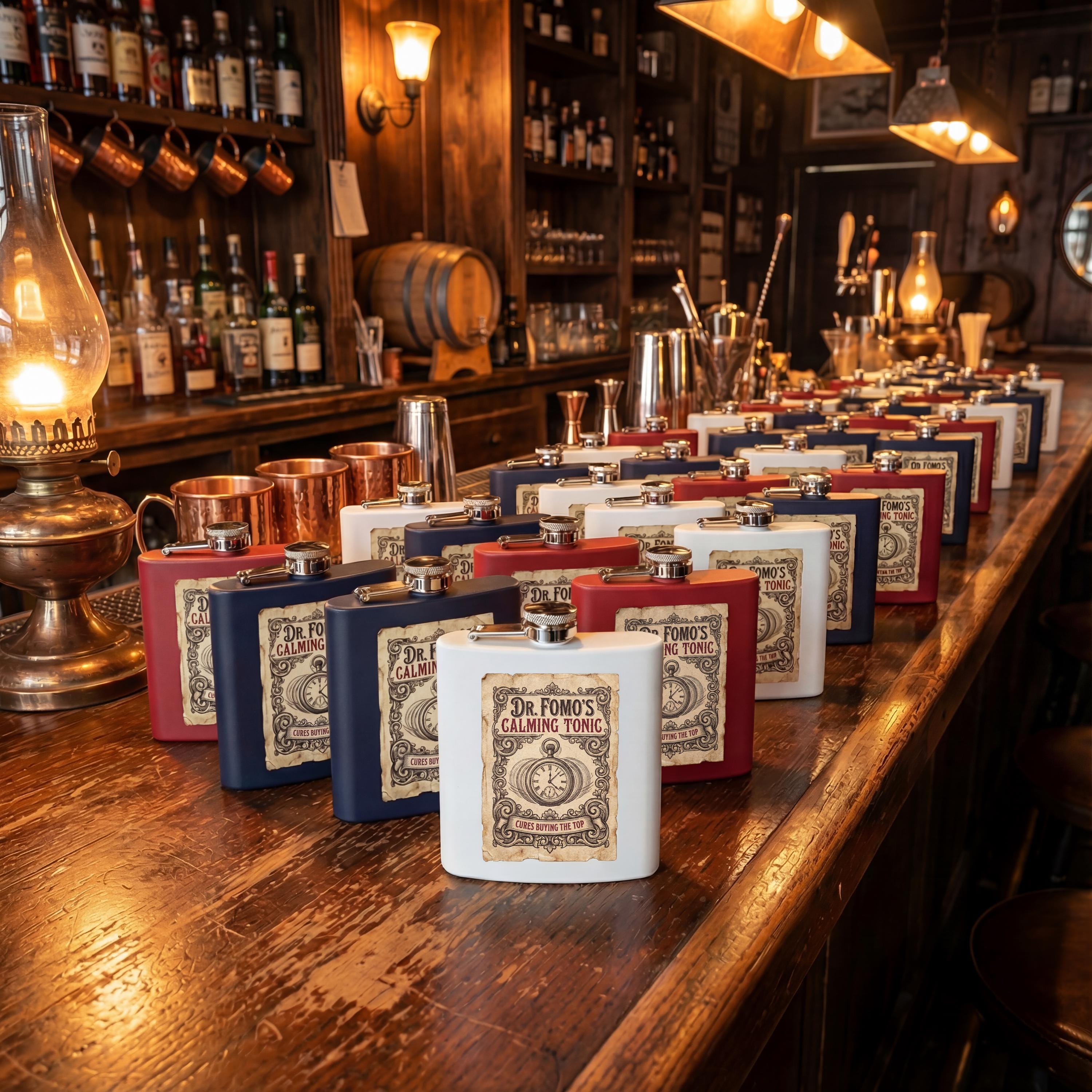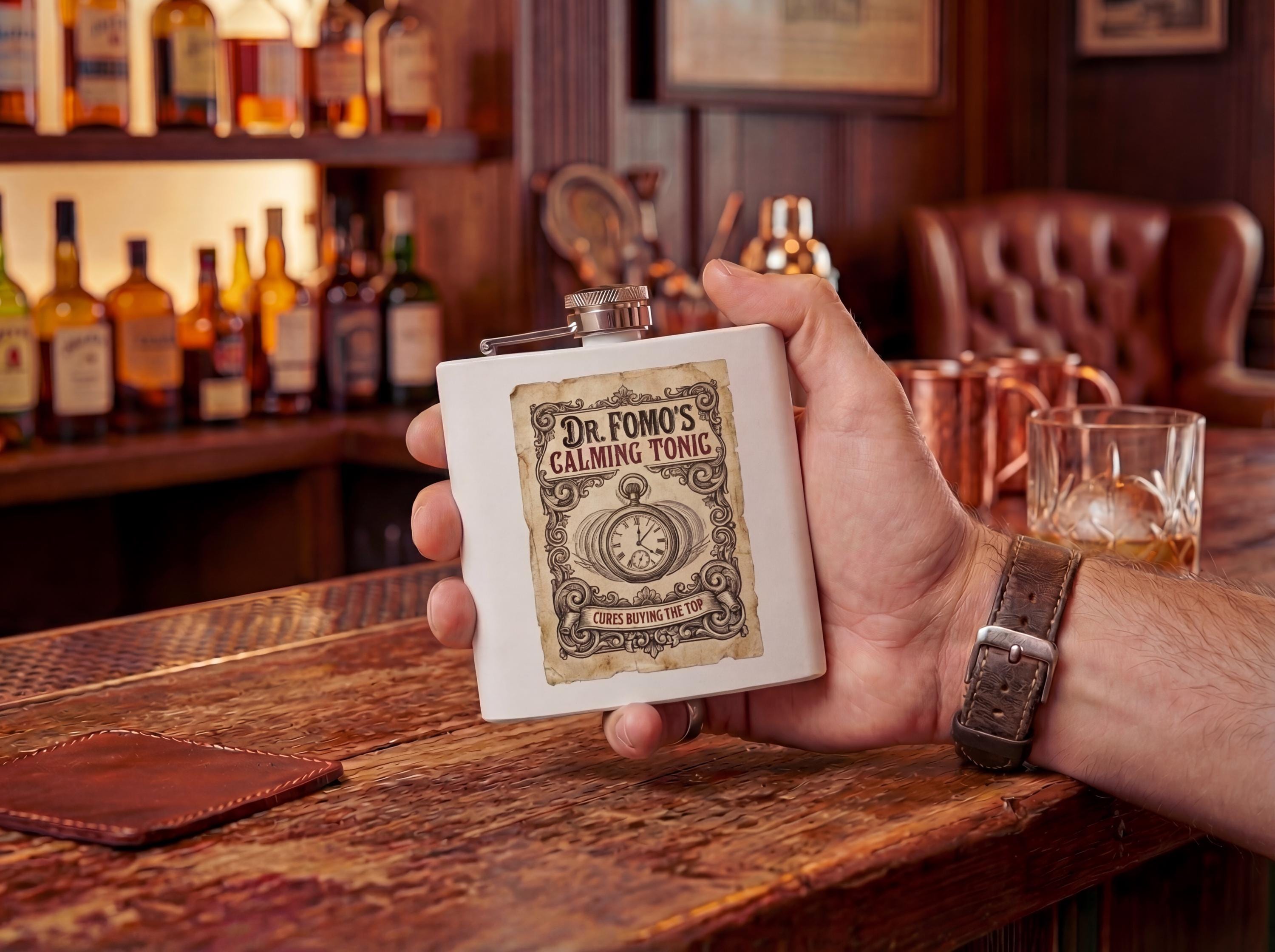 Funny Stock Market Gift Flask - "Dr. FOMO's Calming Tonic" - Crypto Trader Gag Present - Wall Street Humor - Investor Whiskey Flask