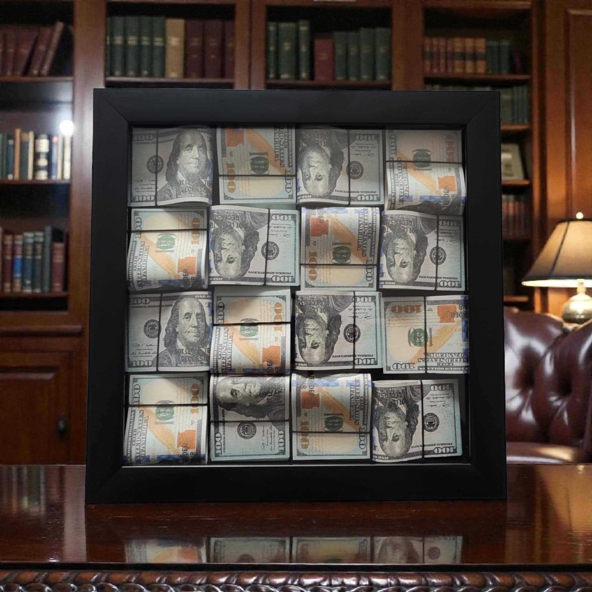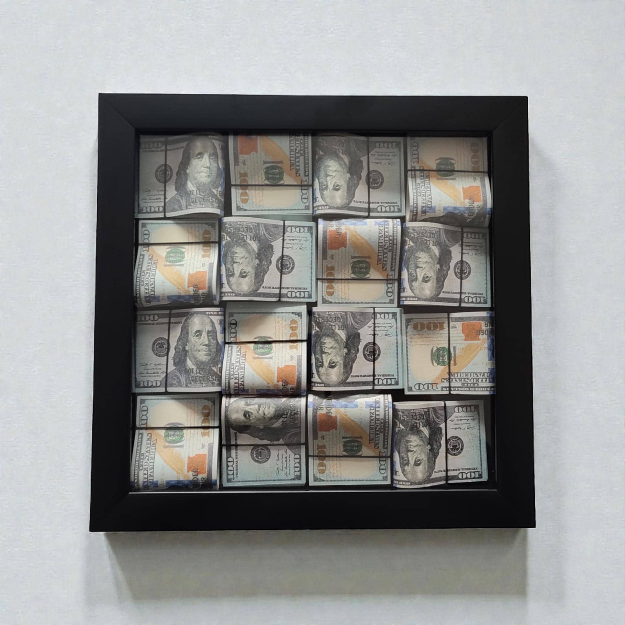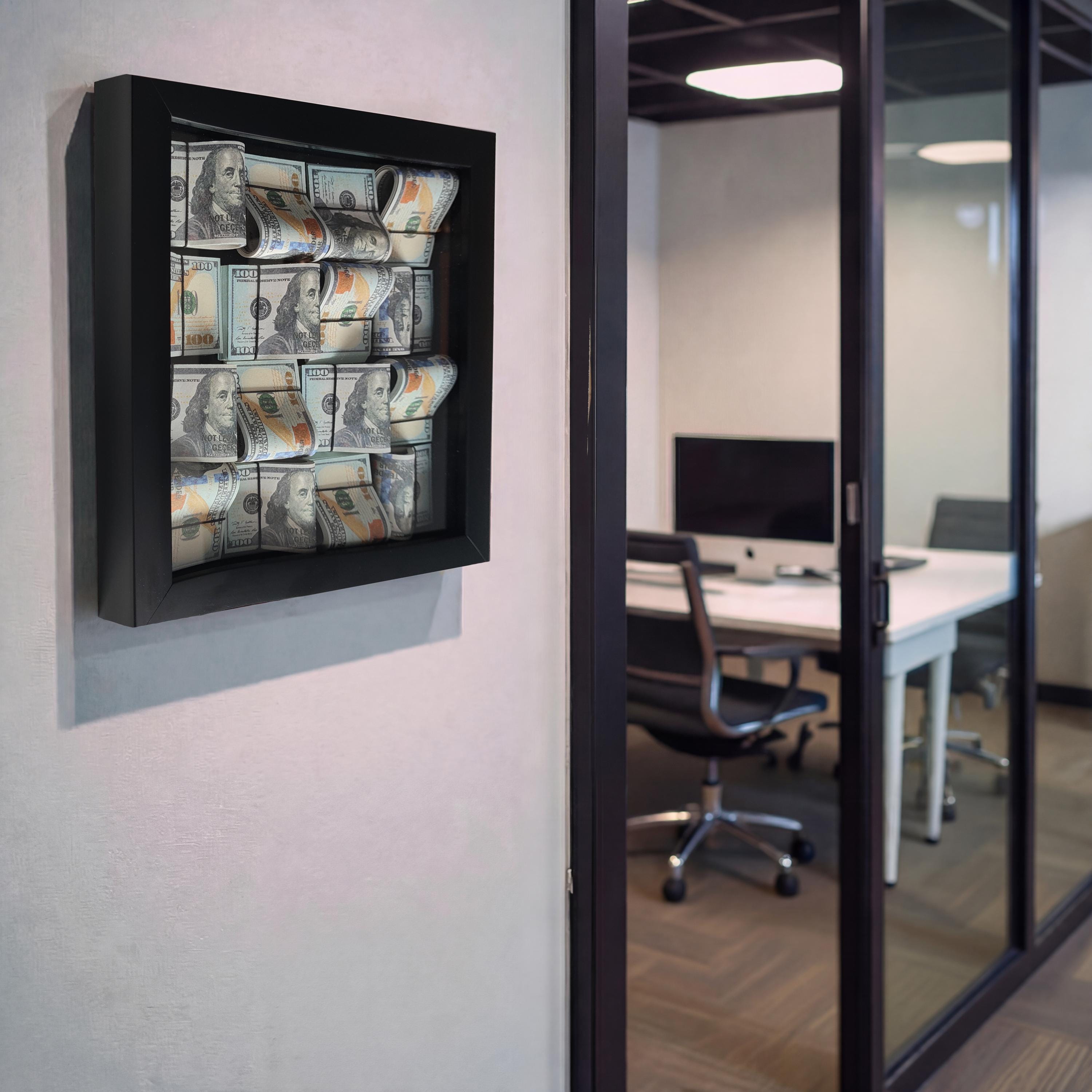 This 13” x 13” luxury money wall art features a deep black frame and a three-dimensional arrangement of rolled $100 bill–style designs, creating a bold and modern look for offices and workspaces.