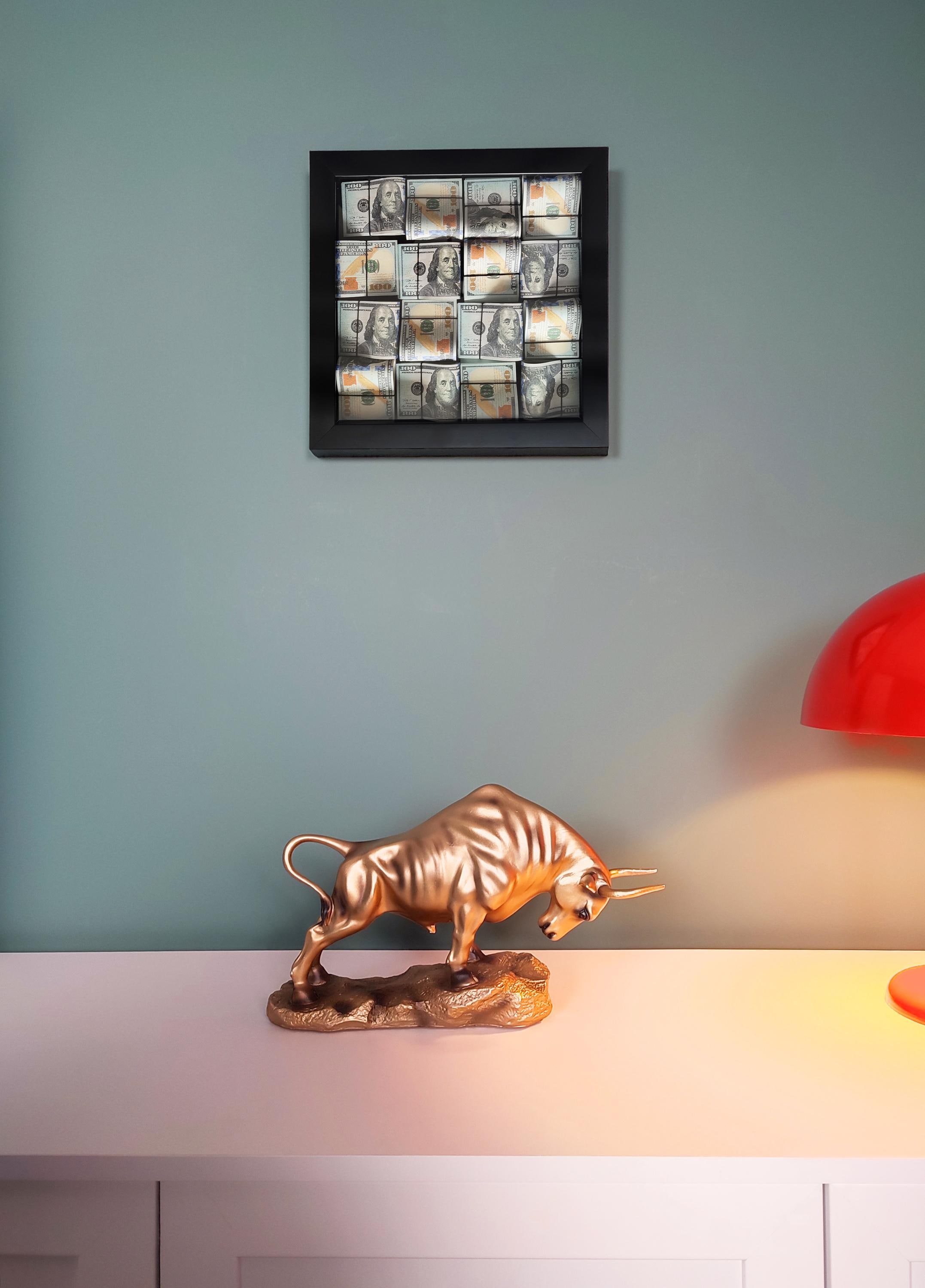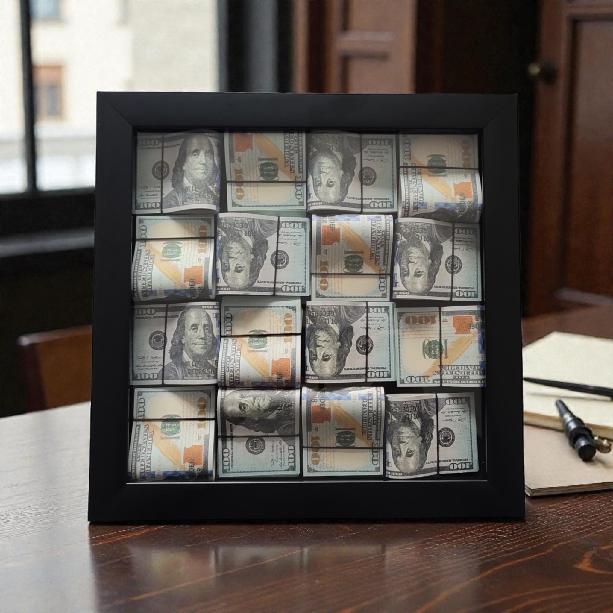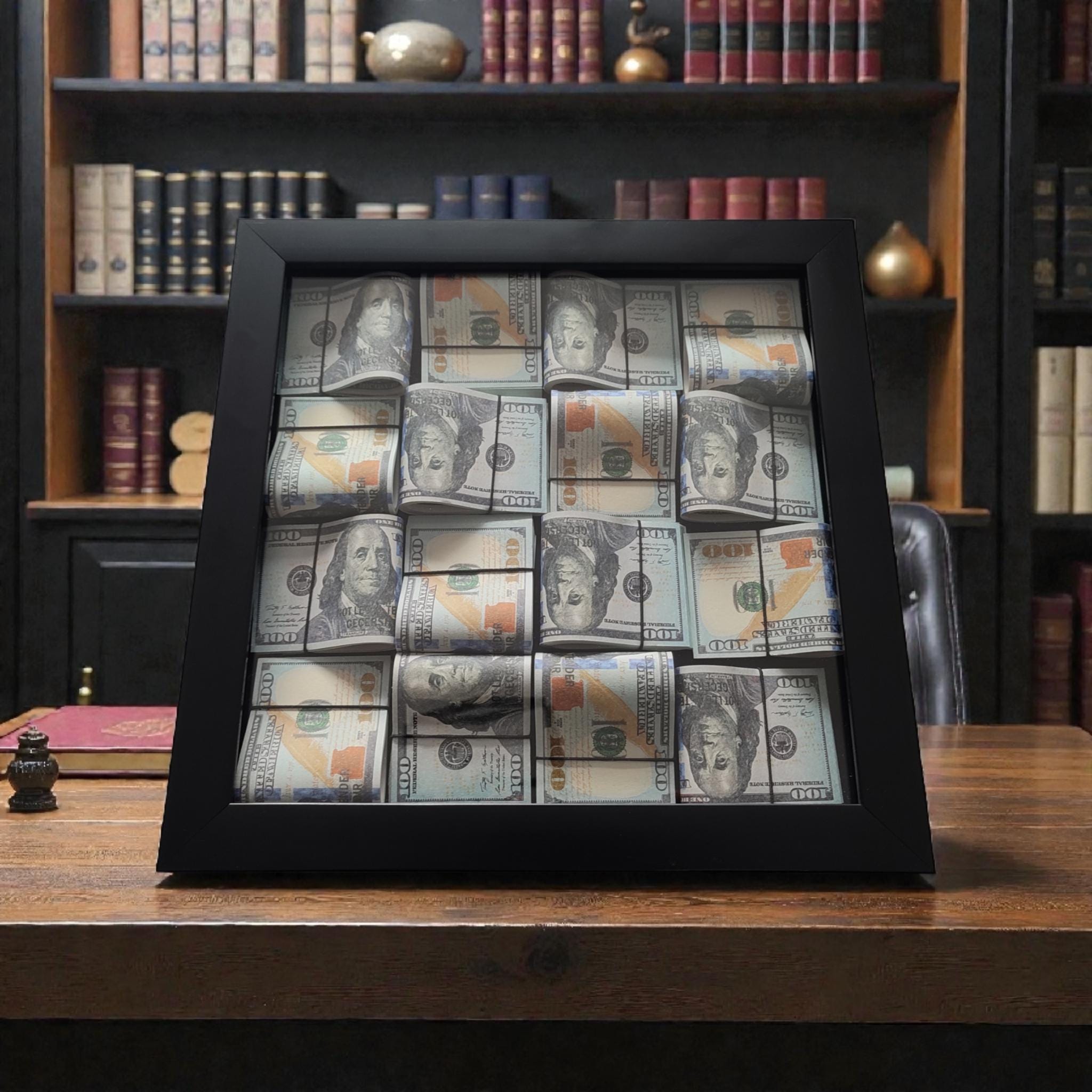 This 13” x 13” luxury money wall art features a deep black frame and a three-dimensional arrangement of rolled $100 bill–style designs, creating a bold and modern look for offices and workspaces.